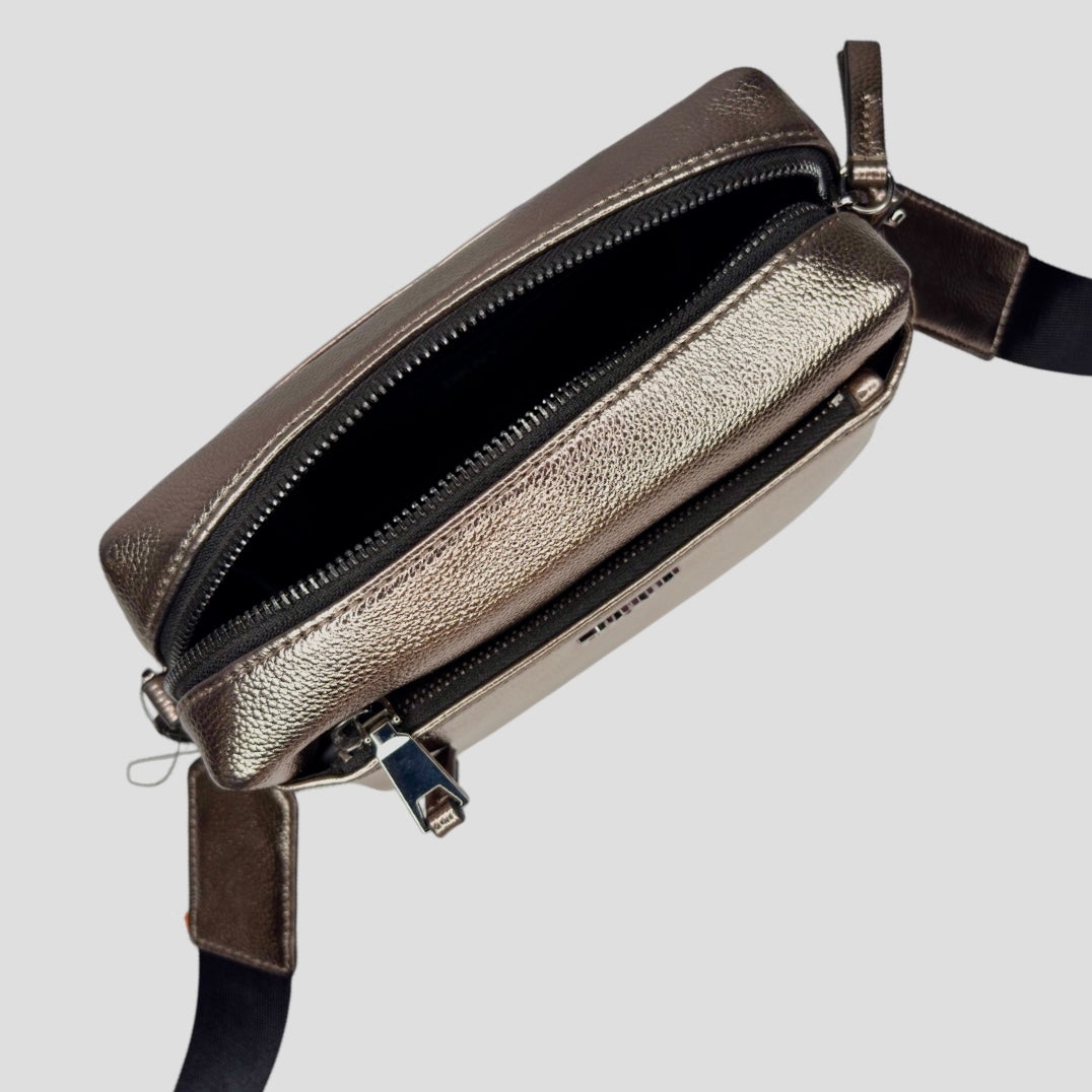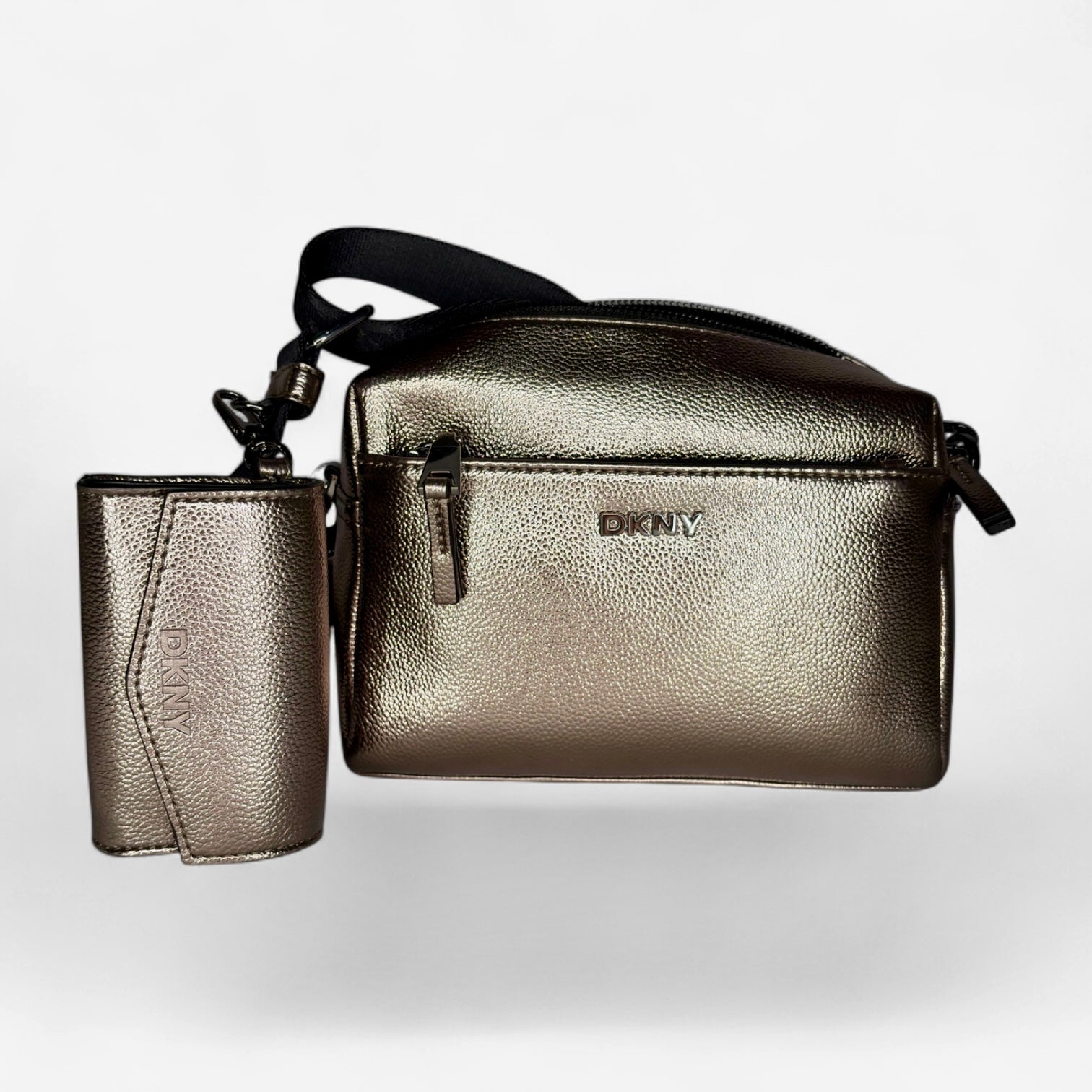 El Bag with Mini Bag de DKNY en tono cobre plateado es una pieza única que mezcla elegancia y estilo moderno. Este diseño innovador incluye un bolso principal con un mini bolso adicional colgando, lo que le da un toque de originalidad y funcionalidad. El acabado en cobre plateado añade un brillo sutil pero sofisticado, convirtiéndolo en un accesorio llamativo para cualquier ocasión. Ideal para quienes buscan un bolso versátil que se destaque, este Bag with Mini Bag de DKNY es perfecto para quienes aprecian un diseño chic y vanguardista. ¡Una pieza imprescindible para tu colección!