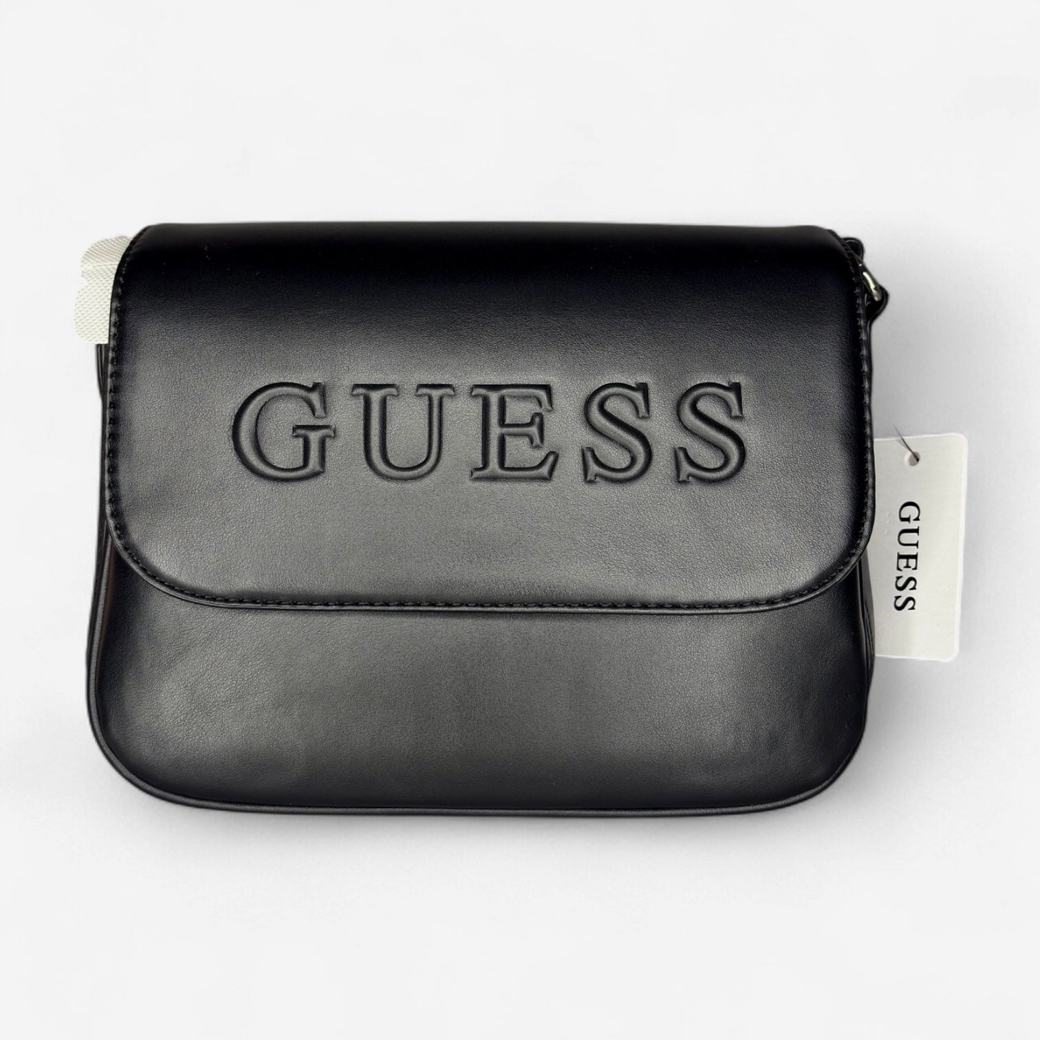 Bolso tipo crossbody en color negro, confeccionado en material rígido tipo piel, que aporta estructura y un estilo elegante. Cuenta con una correa gruesa y ajustable, grabada con el logo de la marca, añadiendo un toque moderno y distintivo. Su diseño funcional con apertura superior lo hace práctico y versátil para el uso diario.