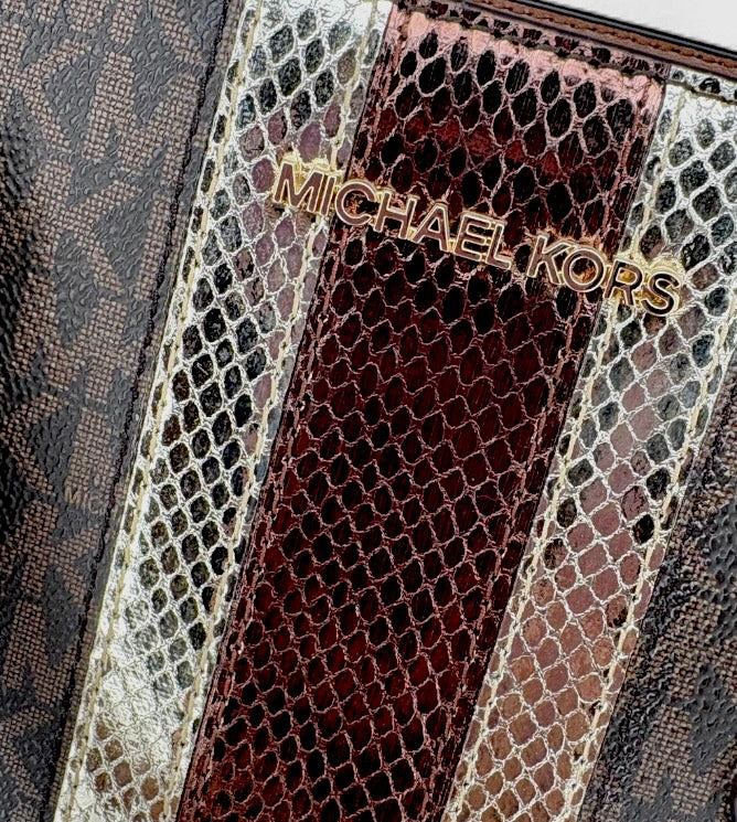 Destaca con esta espectacular bolsa de la marca Michael Kors, diseñada para mujeres que aman los detalles de lujo. Su acabado brillante tipo víbora en color café se combina con sutiles toques dorados y plateados, creando un diseño único y moderno. El estampado con el logo de la marca le da un toque distintivo, ideal para elevar cualquier look con elegancia y personalidad. Perfecta para ocasiones especiales o para un outfit diario con estilo.