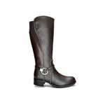 Bota alta café con hebilla y costuras decorativas (mujer)