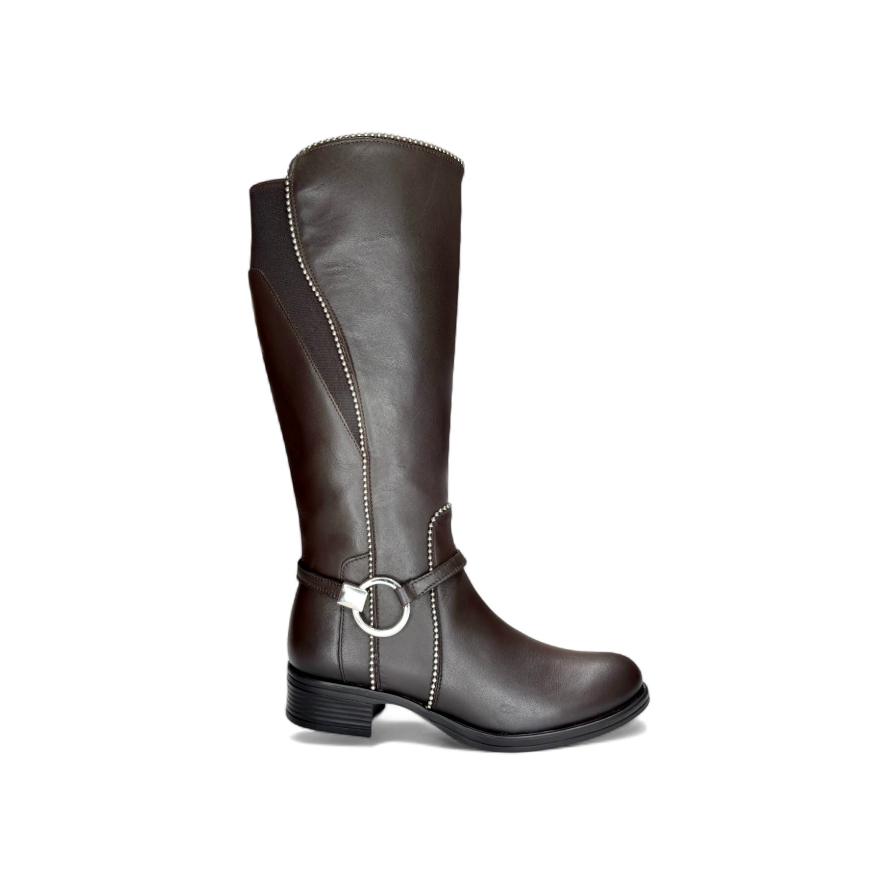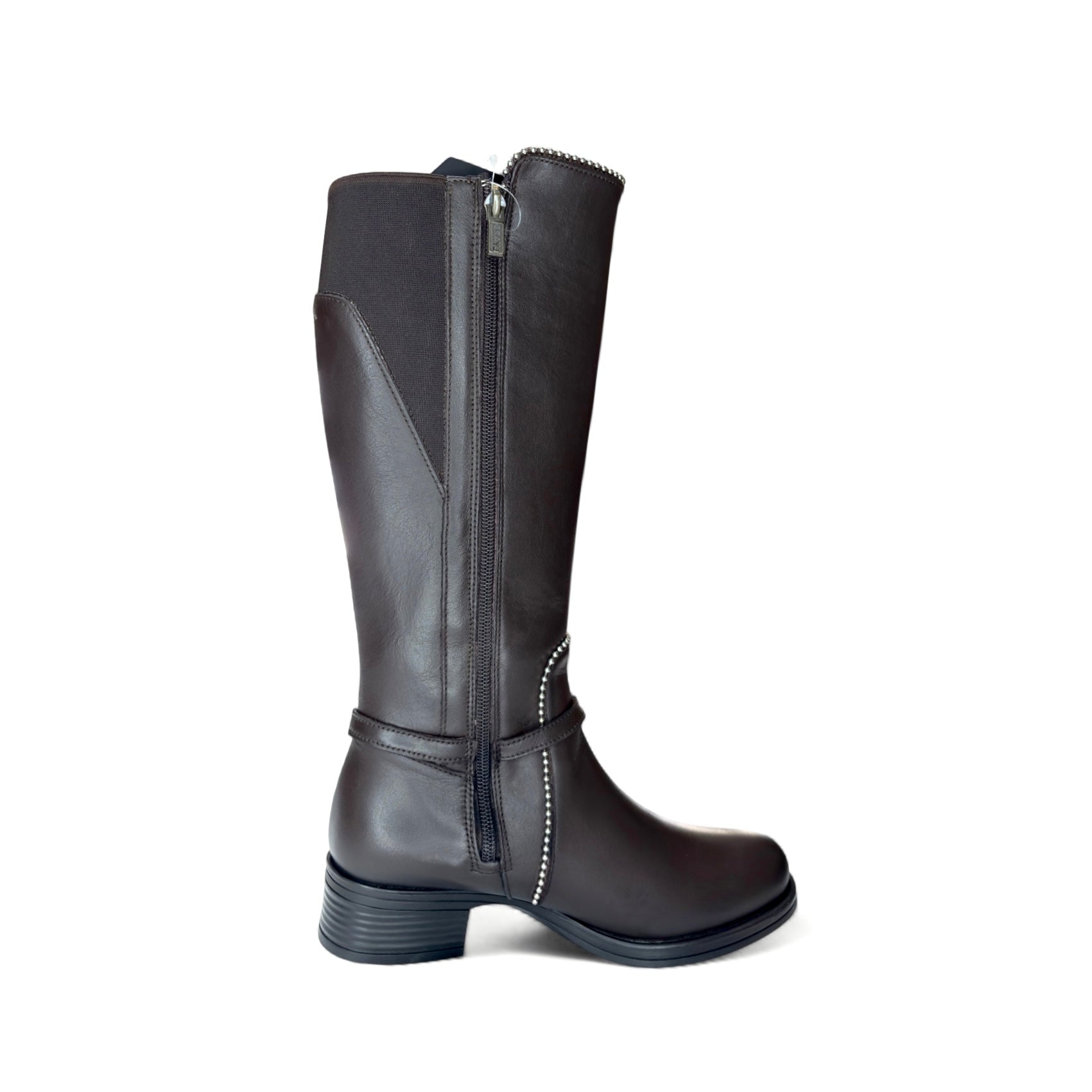 “Bota alta en color café con detalle de hebilla y costuras en contraste. Estilo clásico y versátil para temporada.”