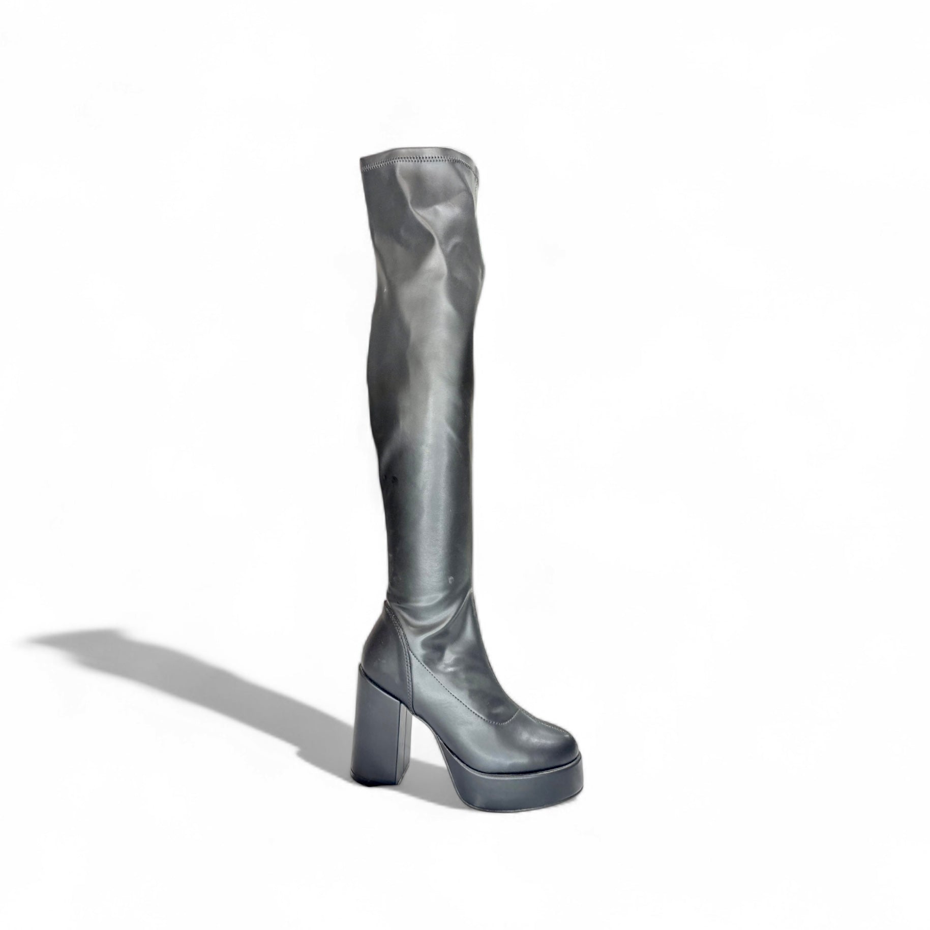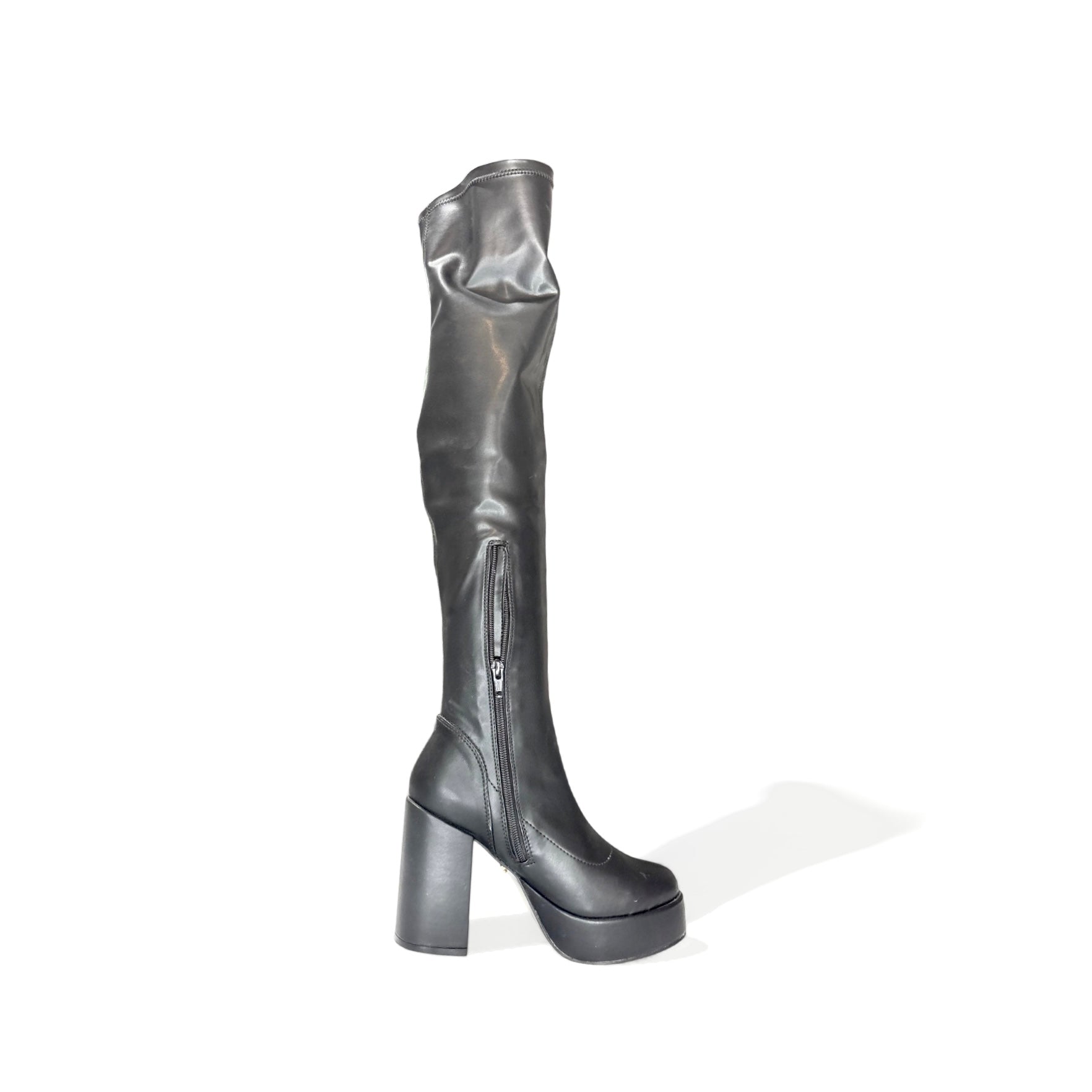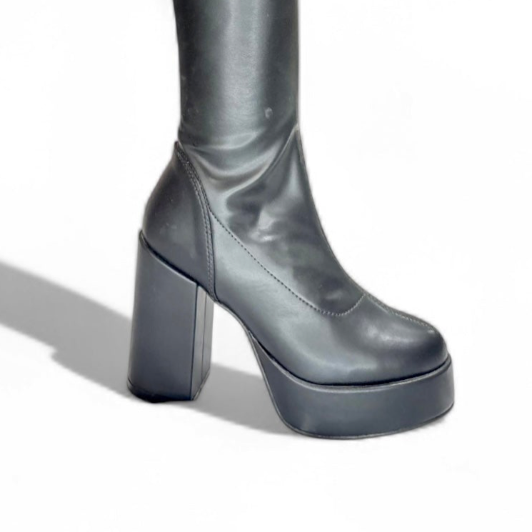 “Bota alta tipo over the knee en color negro, con plataforma y tacón ancho. Diseño atrevido y femenino para destacar en cualquier outfit.”