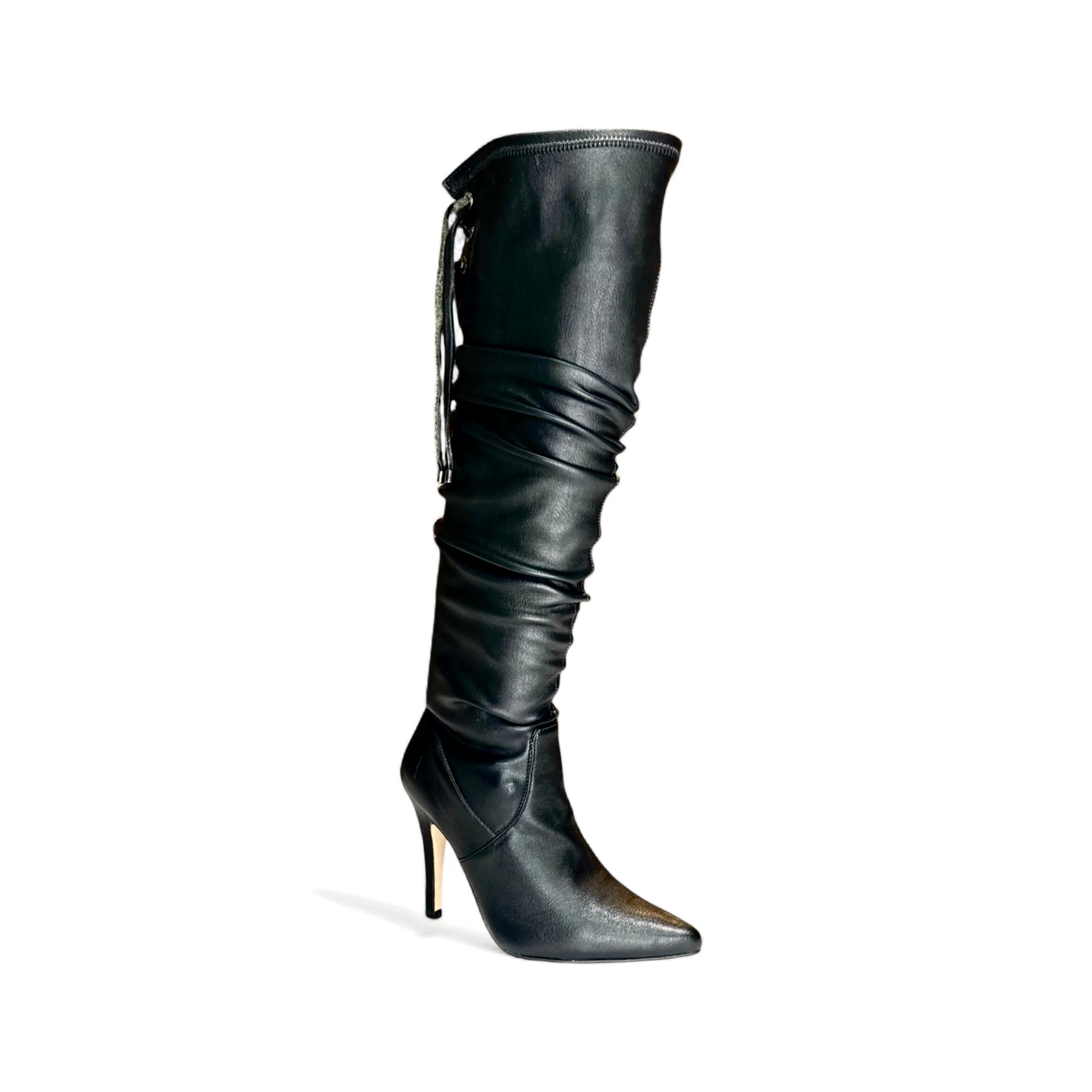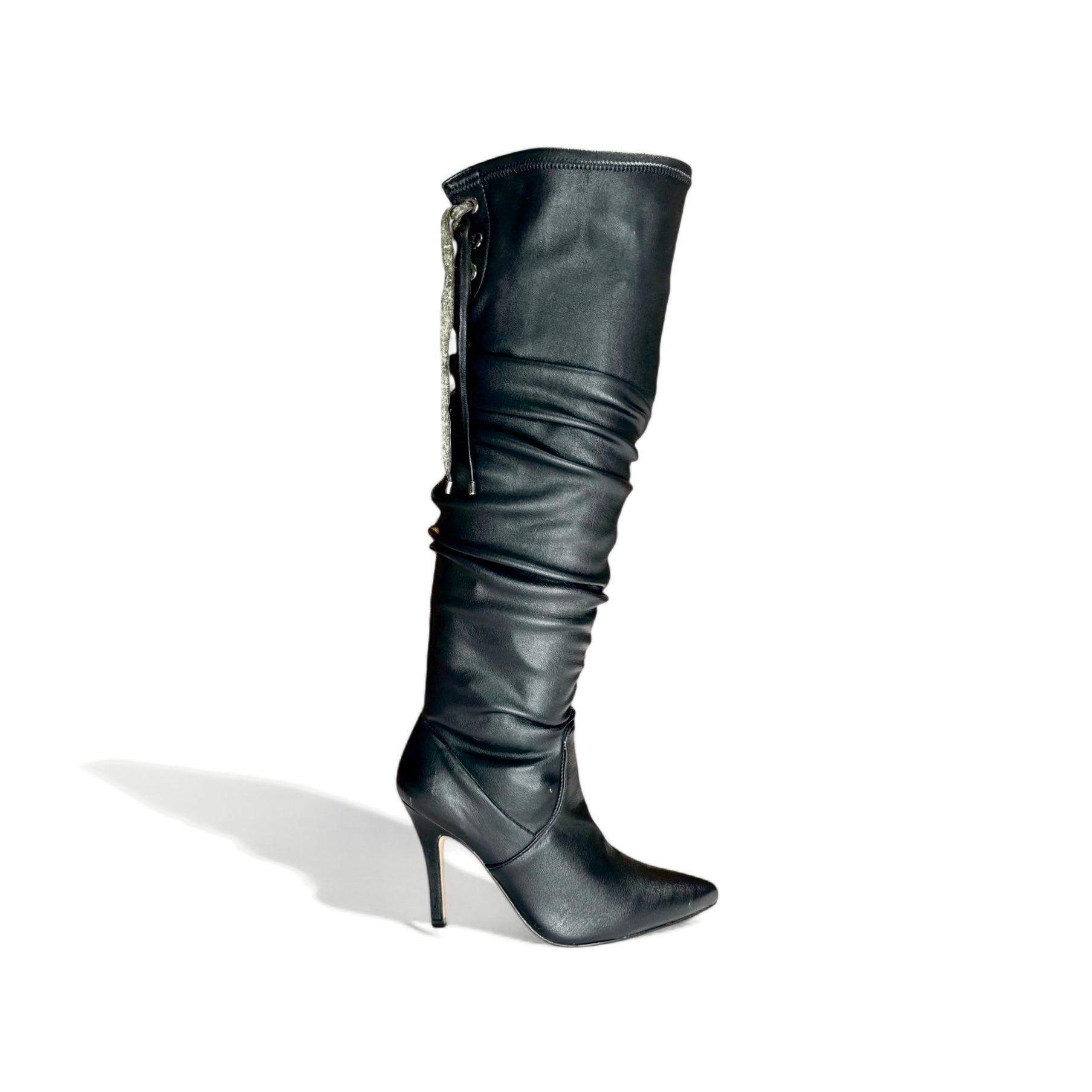 Bota alta en color negro con acabado tipo piel, diseño fruncido y tacón delgado de aguja. Incluye cierre lateral con detalle brillante que aporta un toque sofisticado y glamuroso. Perfecta para noches elegantes, fiestas o un look chic de temporada.
