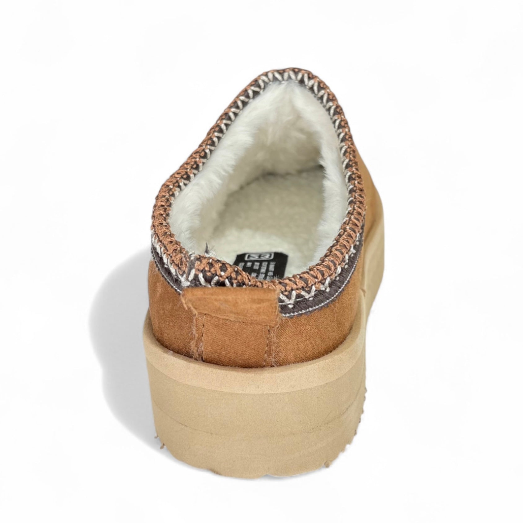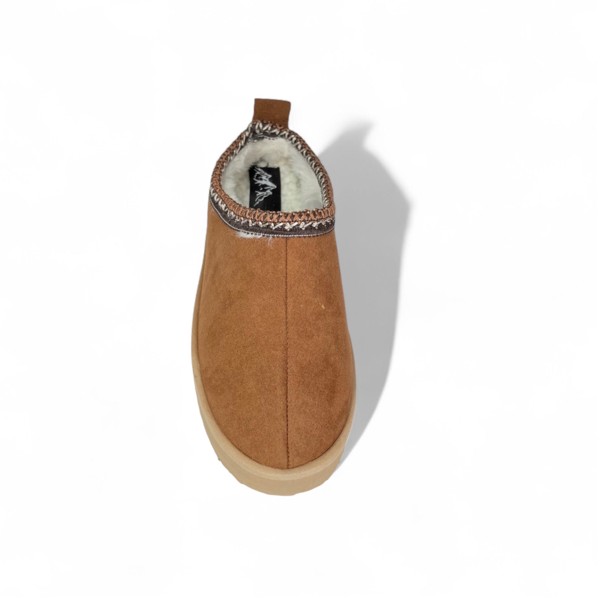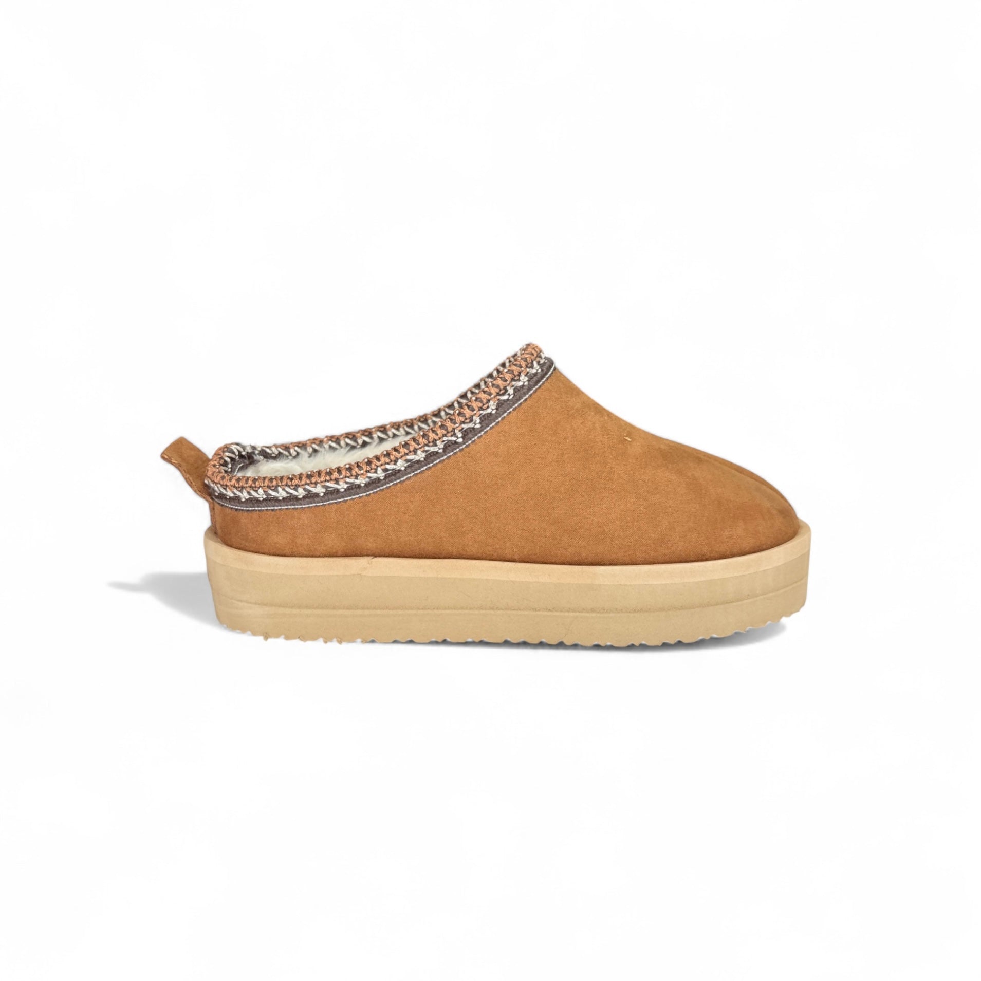 “Pantufla estilo bota baja en color camel con suela ligera y forro cálido. Ideal para estar cómoda y abrigada en casa.”