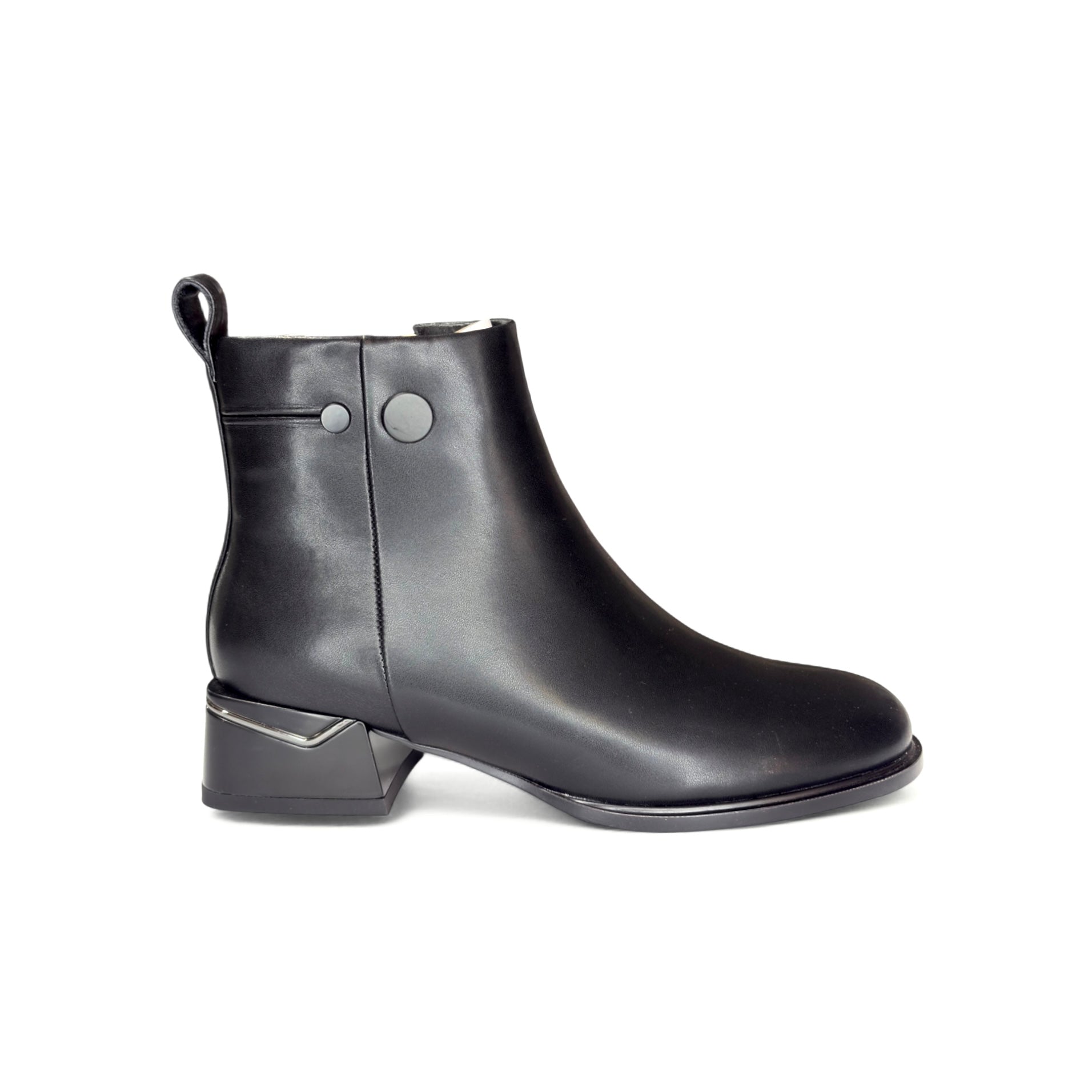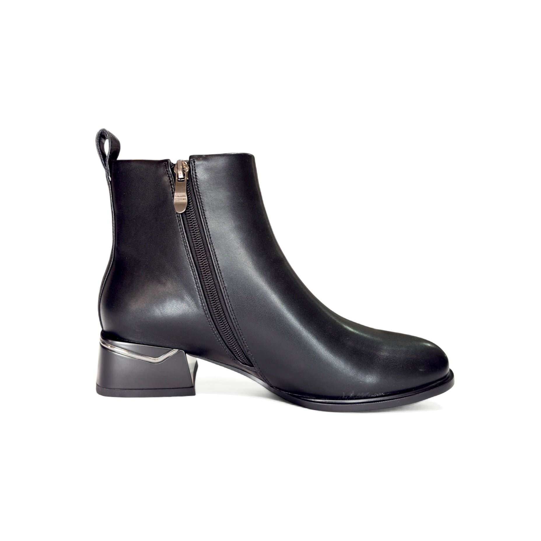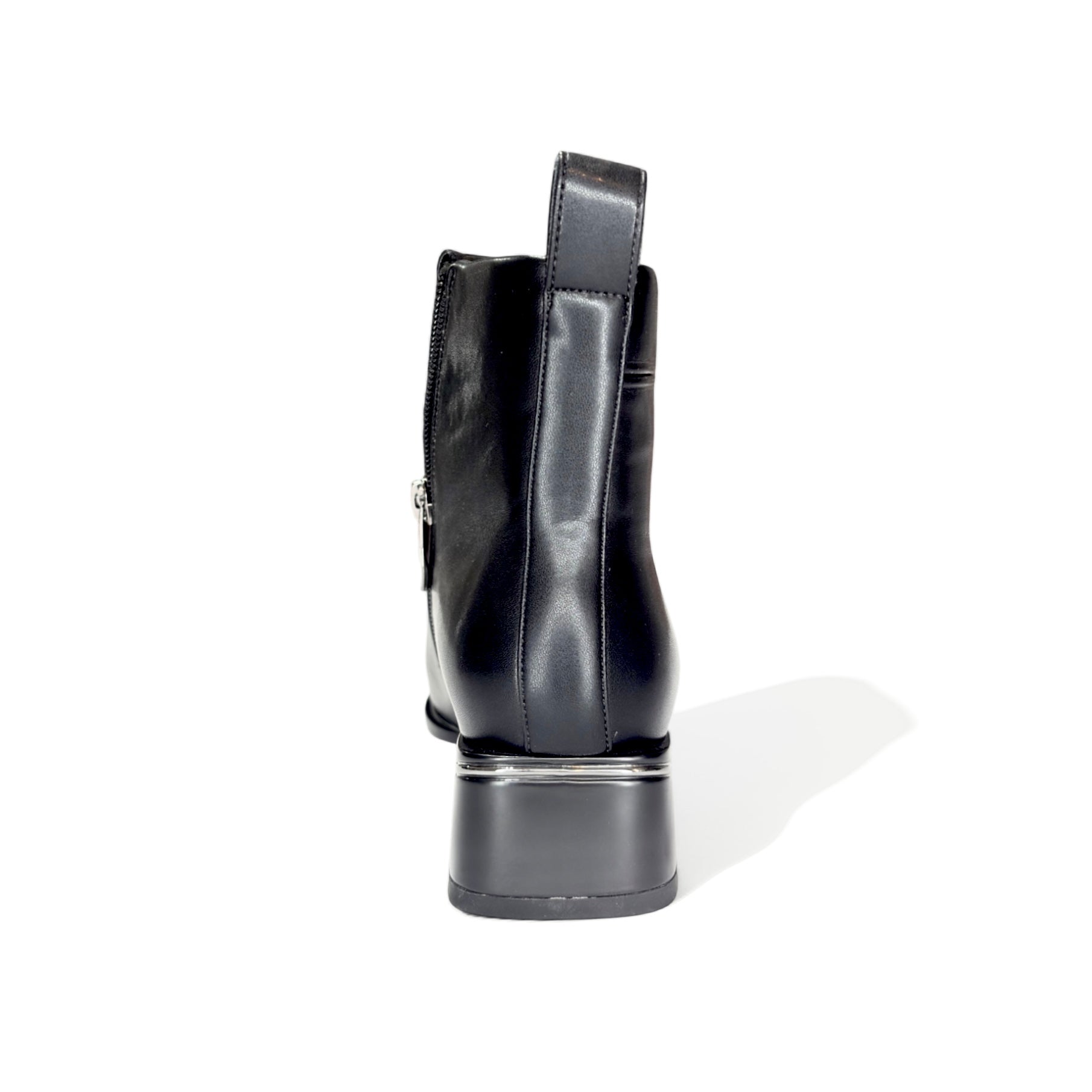 “Botín negro elegante con tacón bajo y detalles metálicos. Versátil y cómodo para combinar con cualquier outfit.”