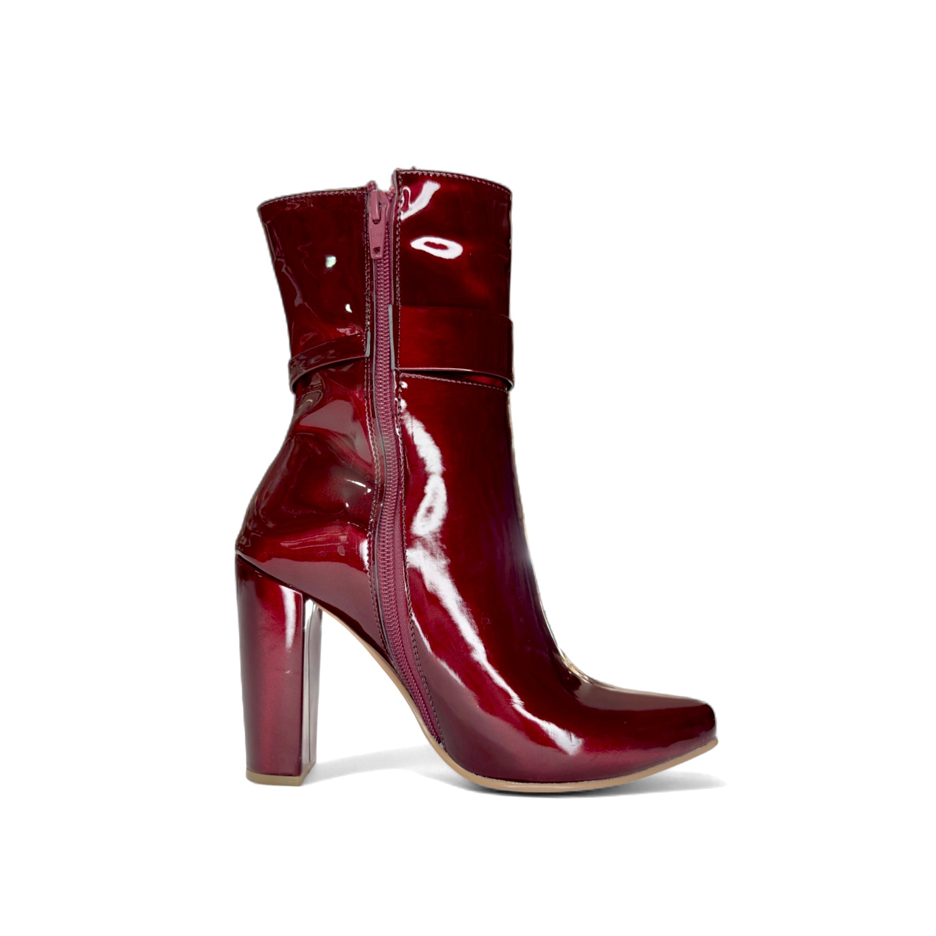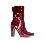 Botín de tacón alto, de charol en color vino con evilla decorativa
