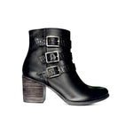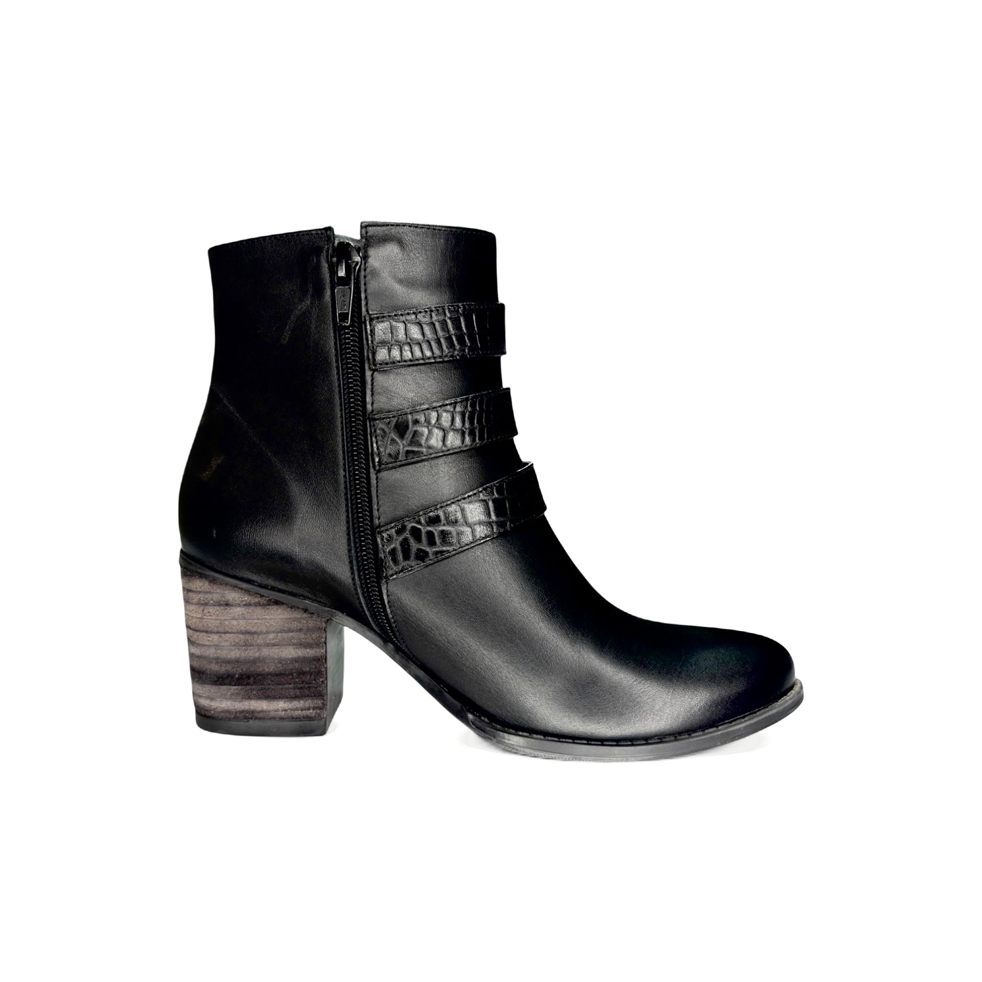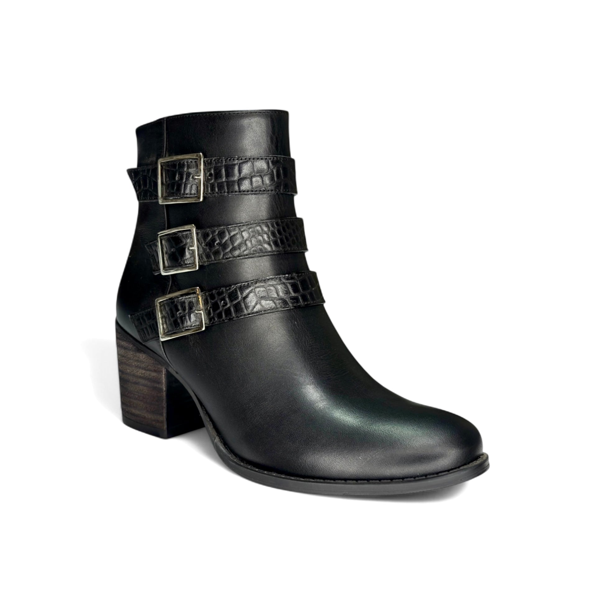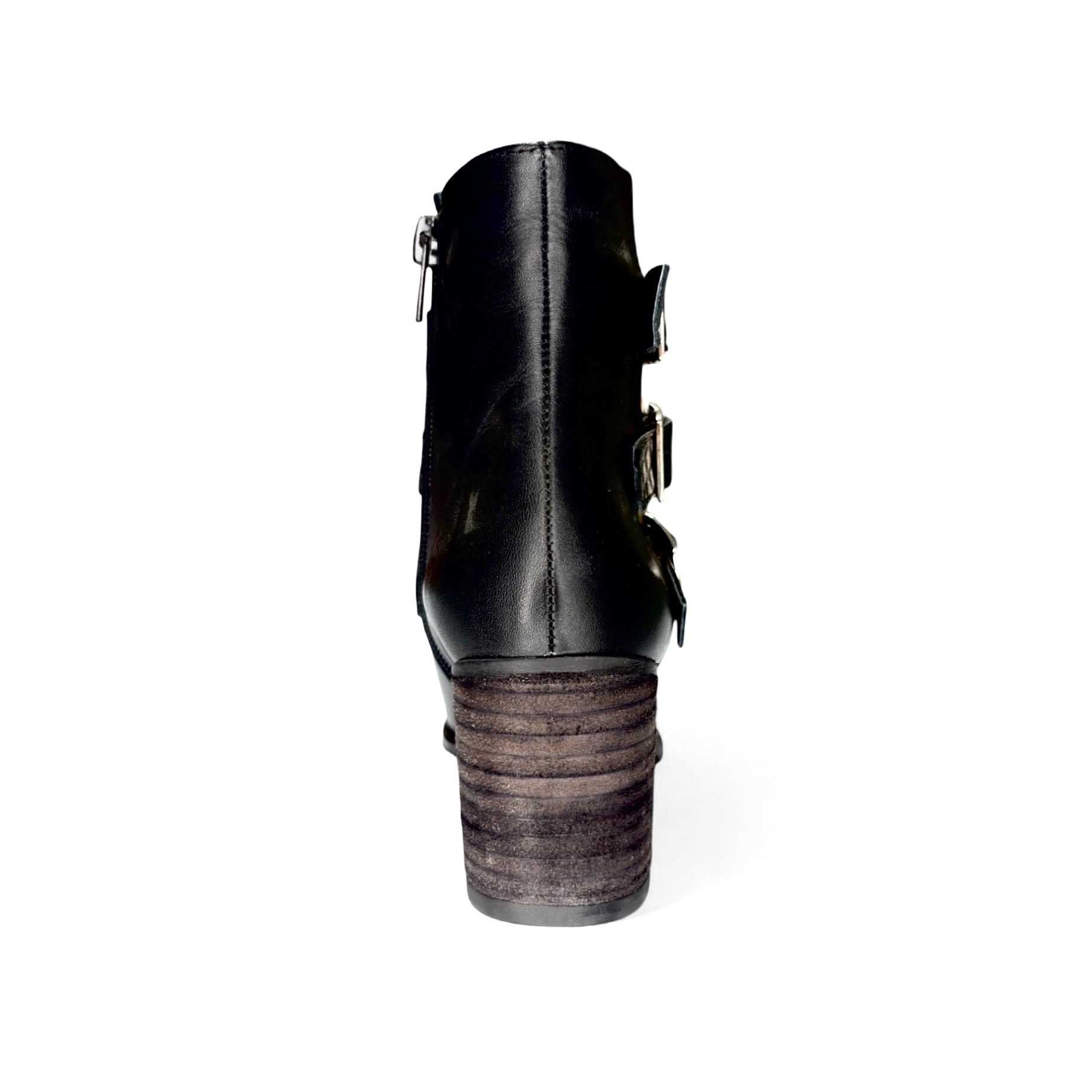 Botín negro con tres correas y hebillas metálicas. Tacón ancho y estilo moderno para un look urbano con personalidad. Material 100% piel
