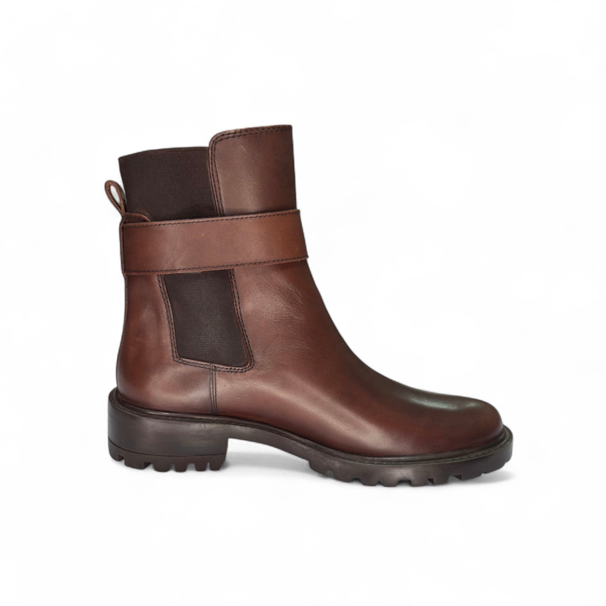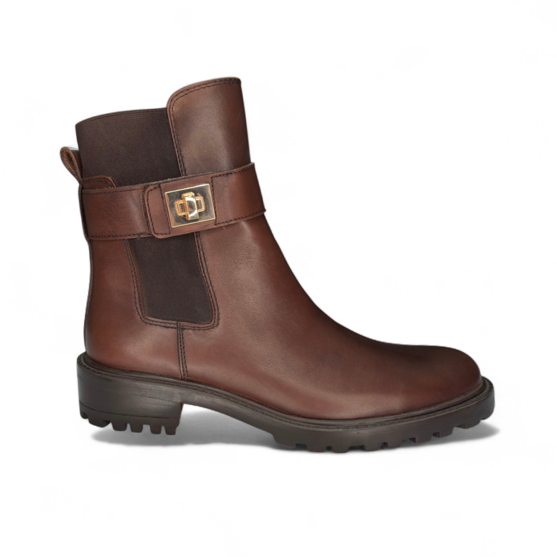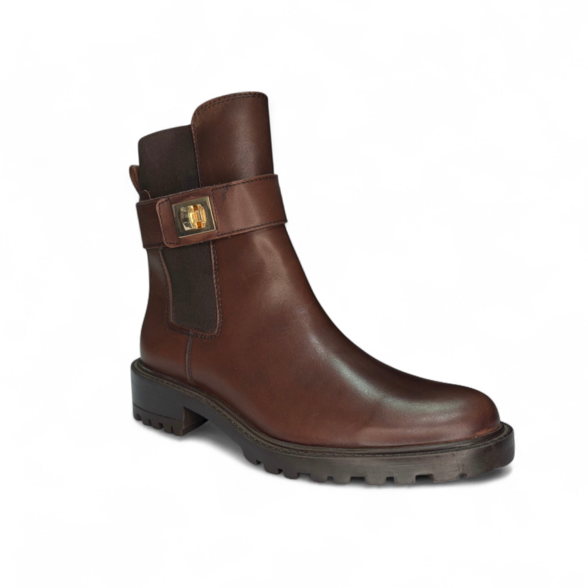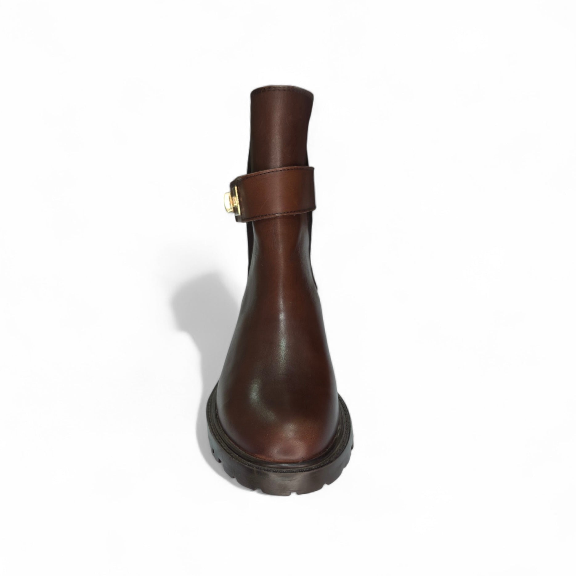 Botín de piel café con suela track y hebilla metálica lateral. Moderno, cómodo y perfecto para el día a día.