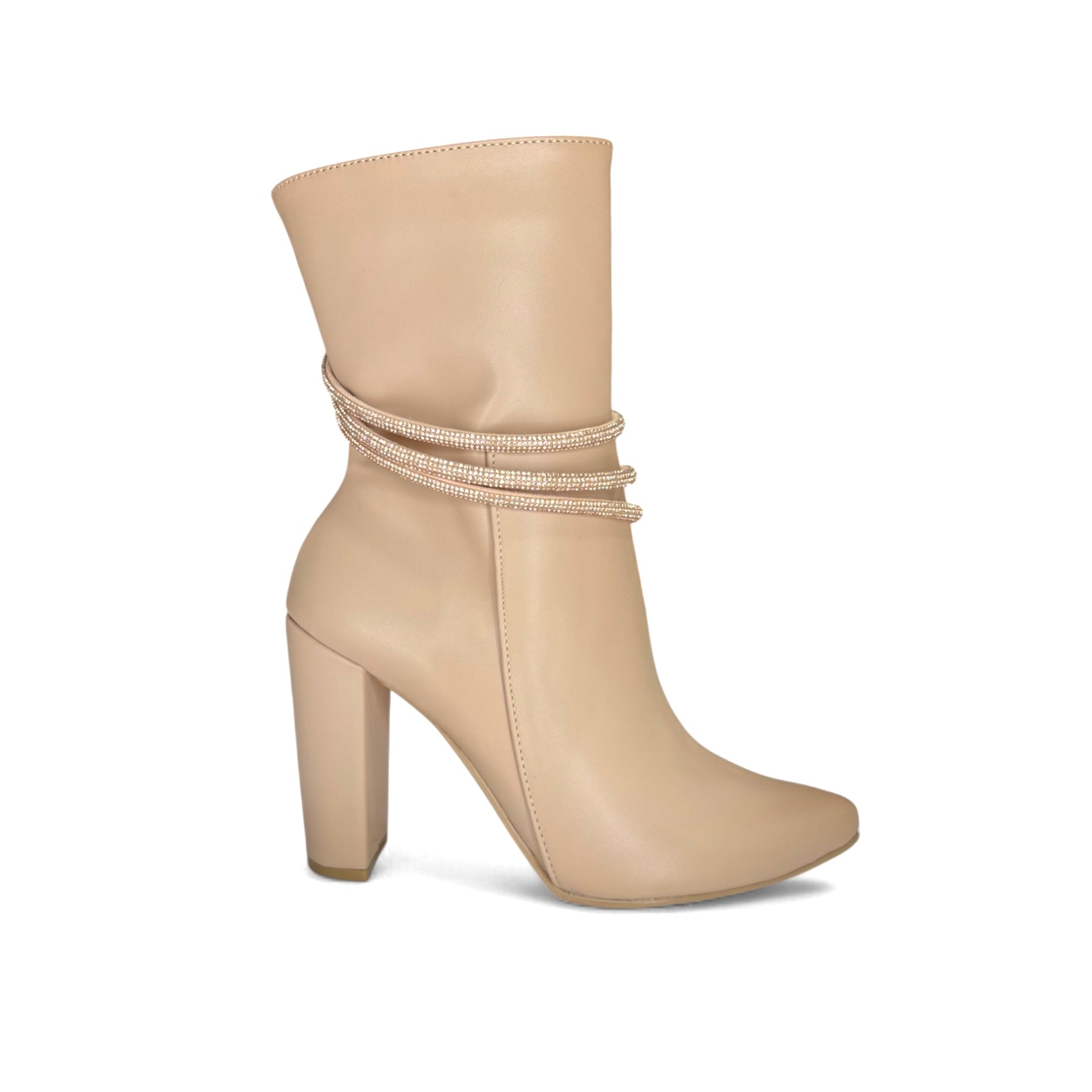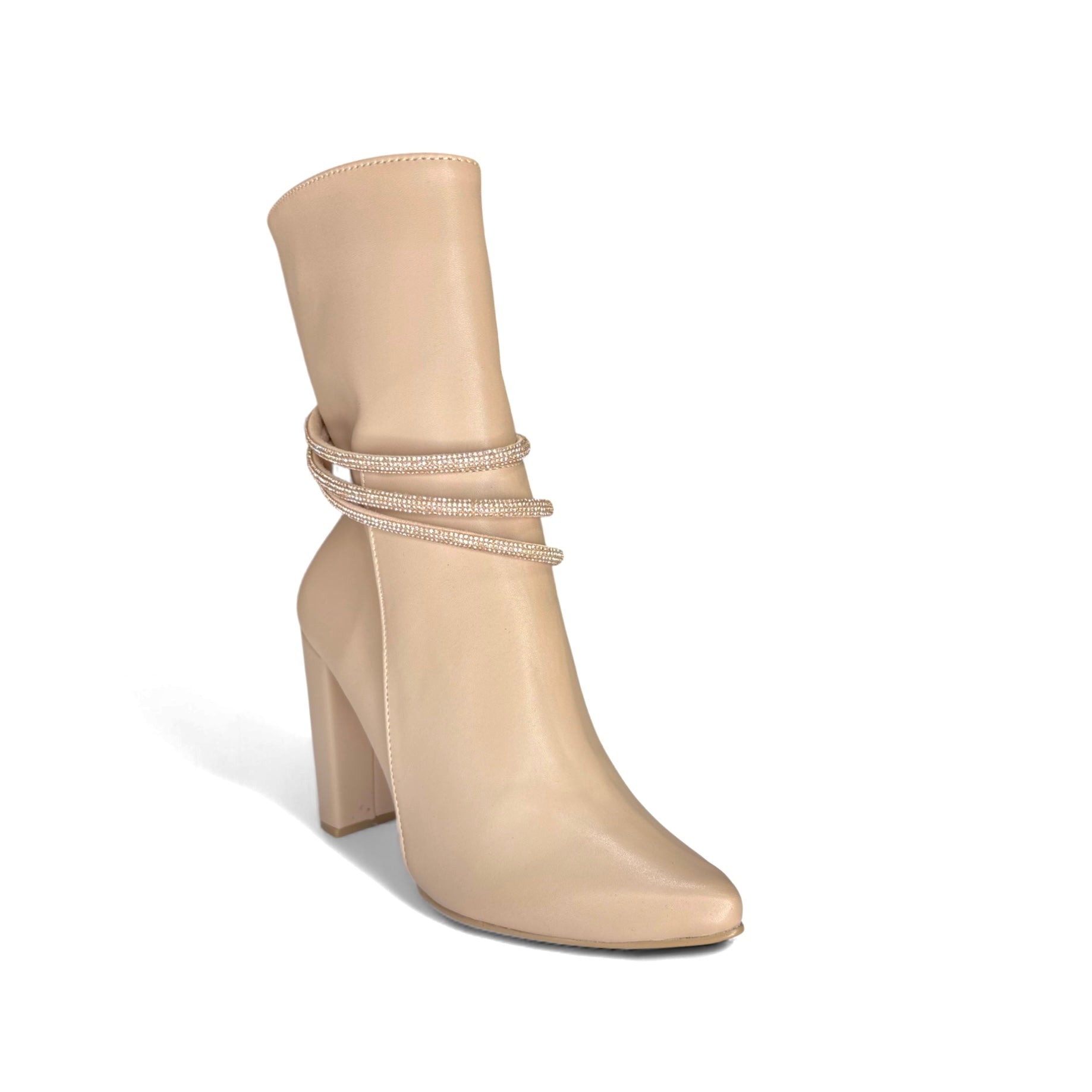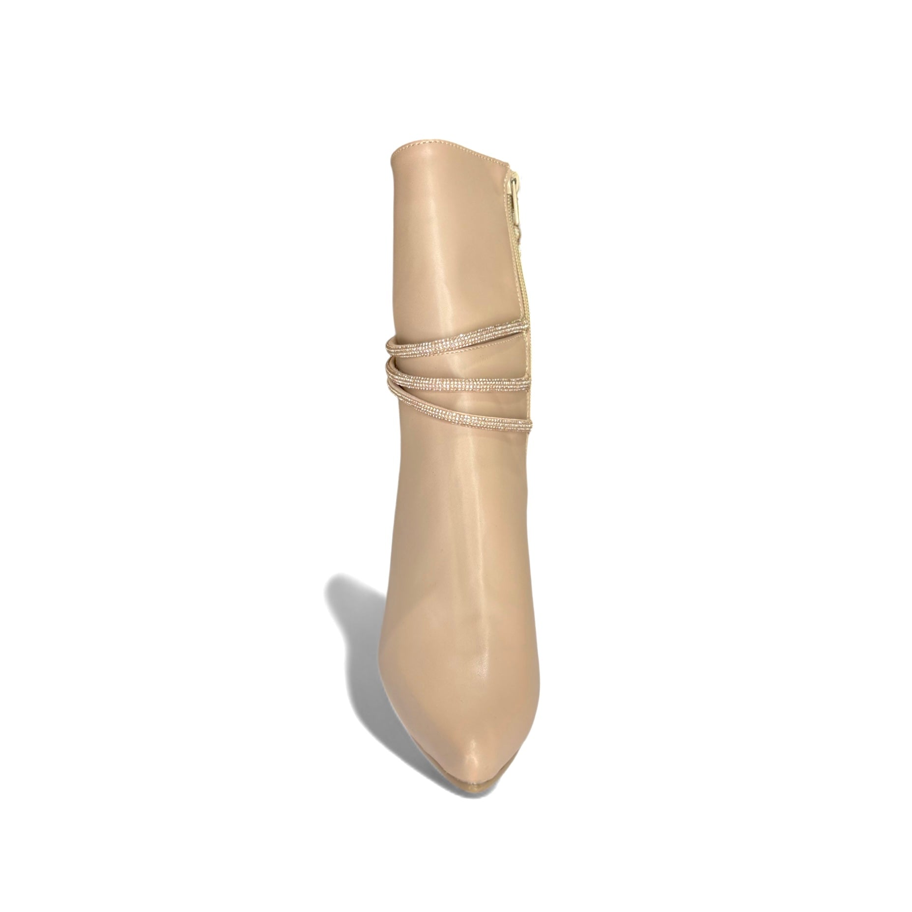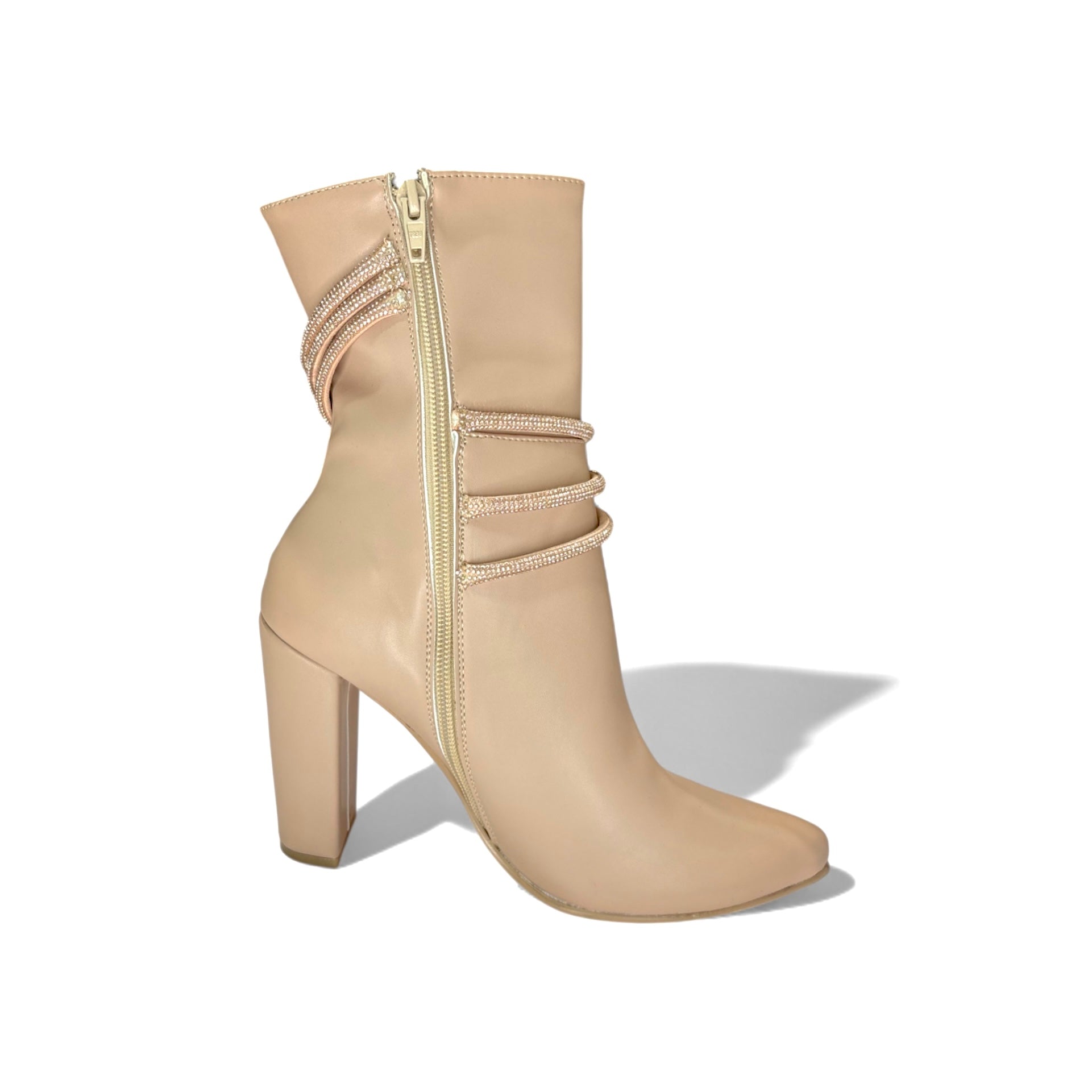 Bota nude de tacón alto con detalle de tiras brillantes. Sofisticada y femenina, ideal para eventos de noche o looks elegantes.