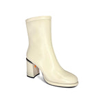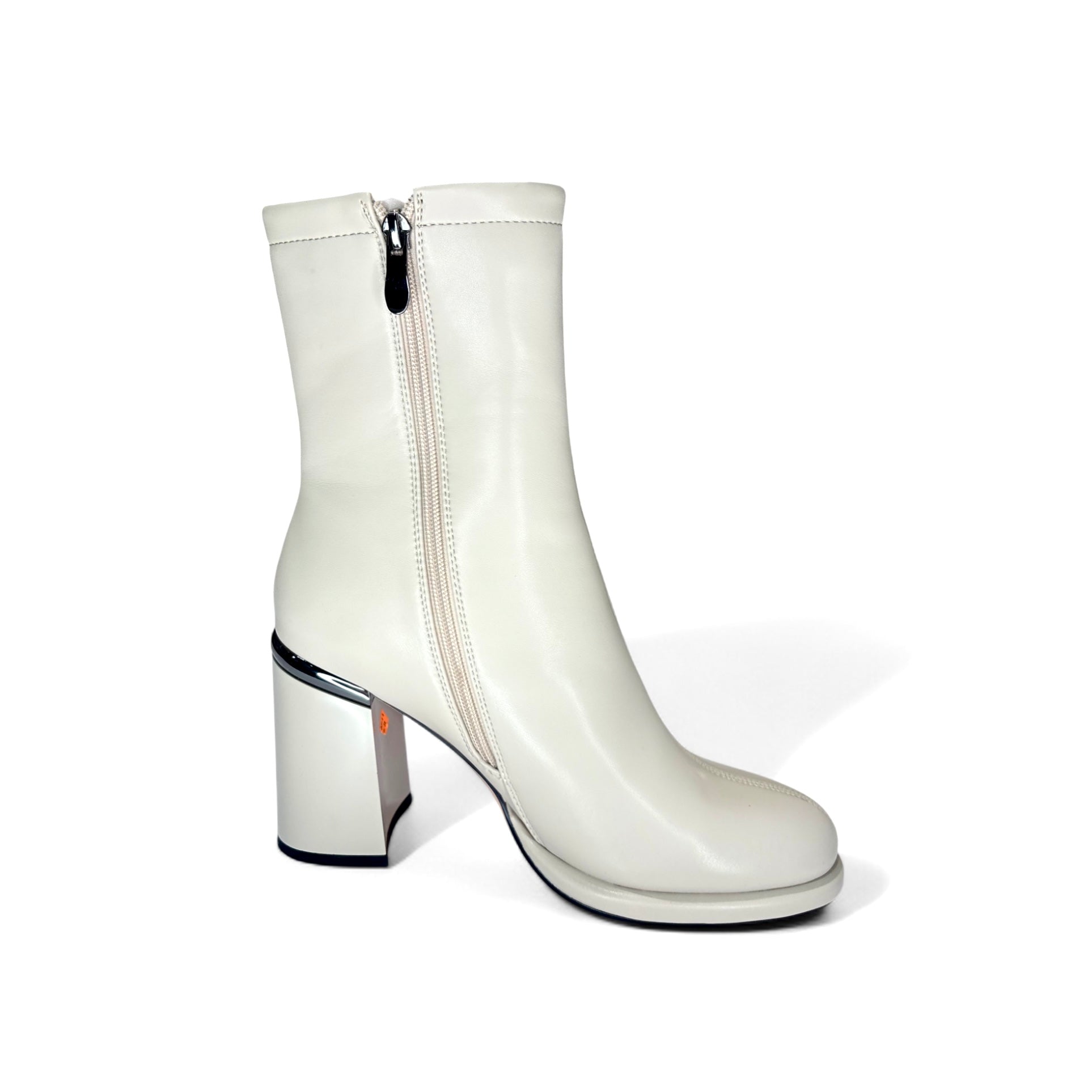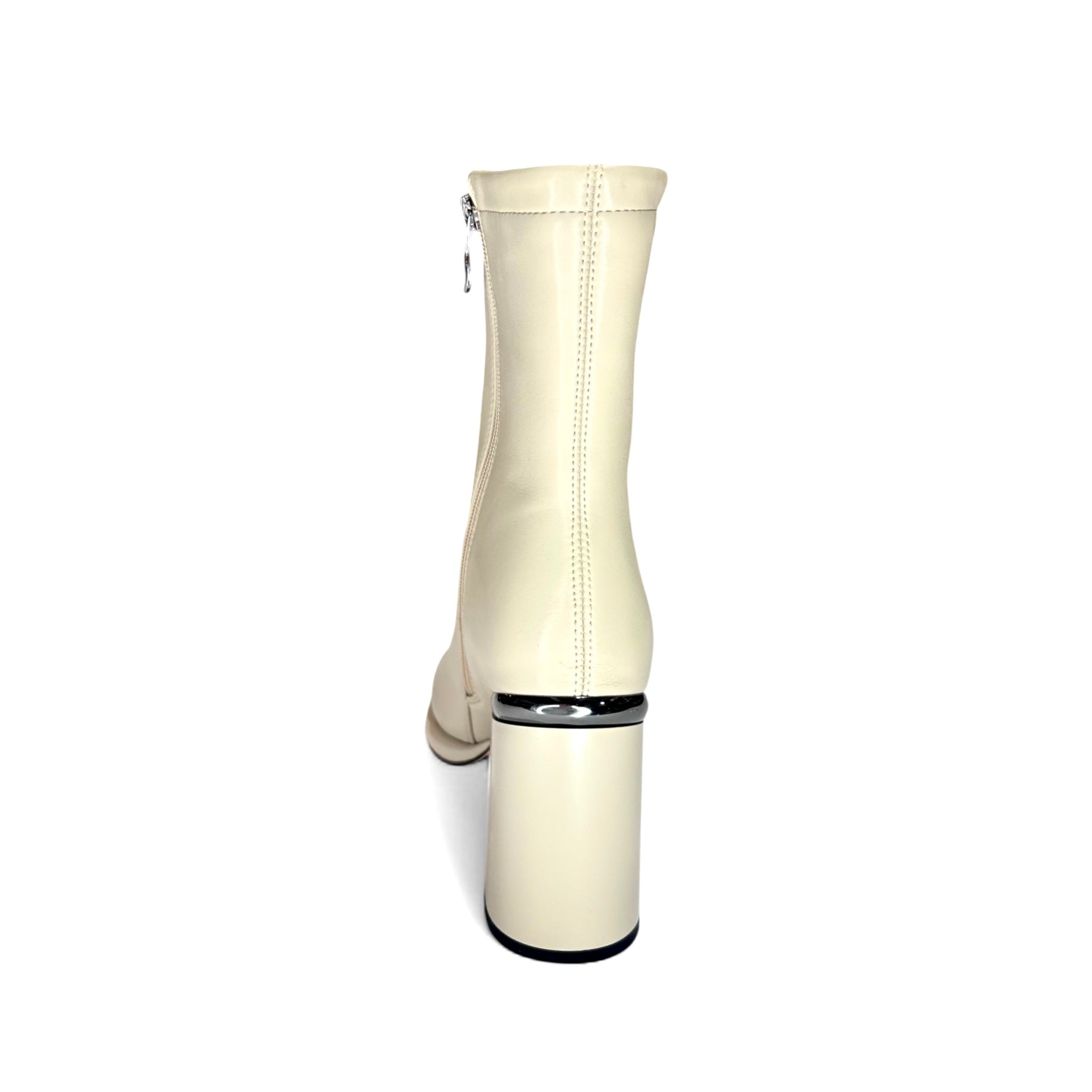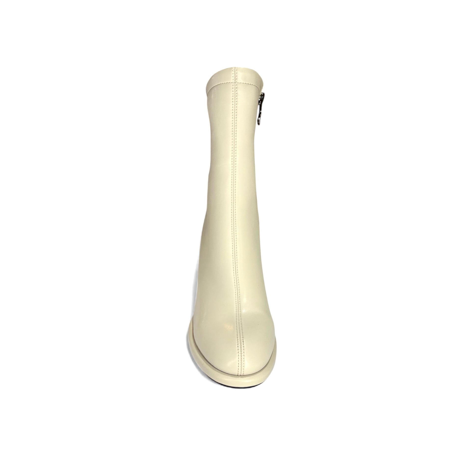 Bota blanca de diseño liso con tacón ancho y acabado brillante. Versátil y moderna, ideal para looks elegantes y minimalistas.