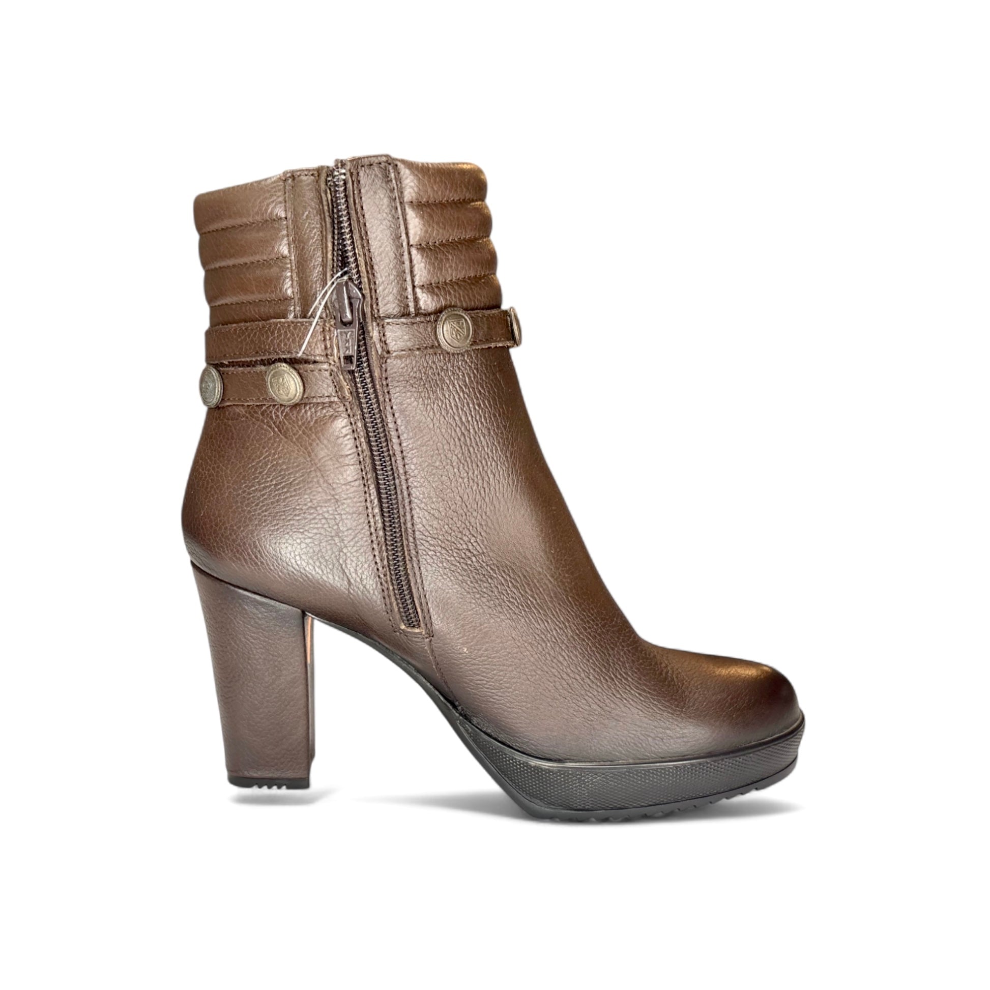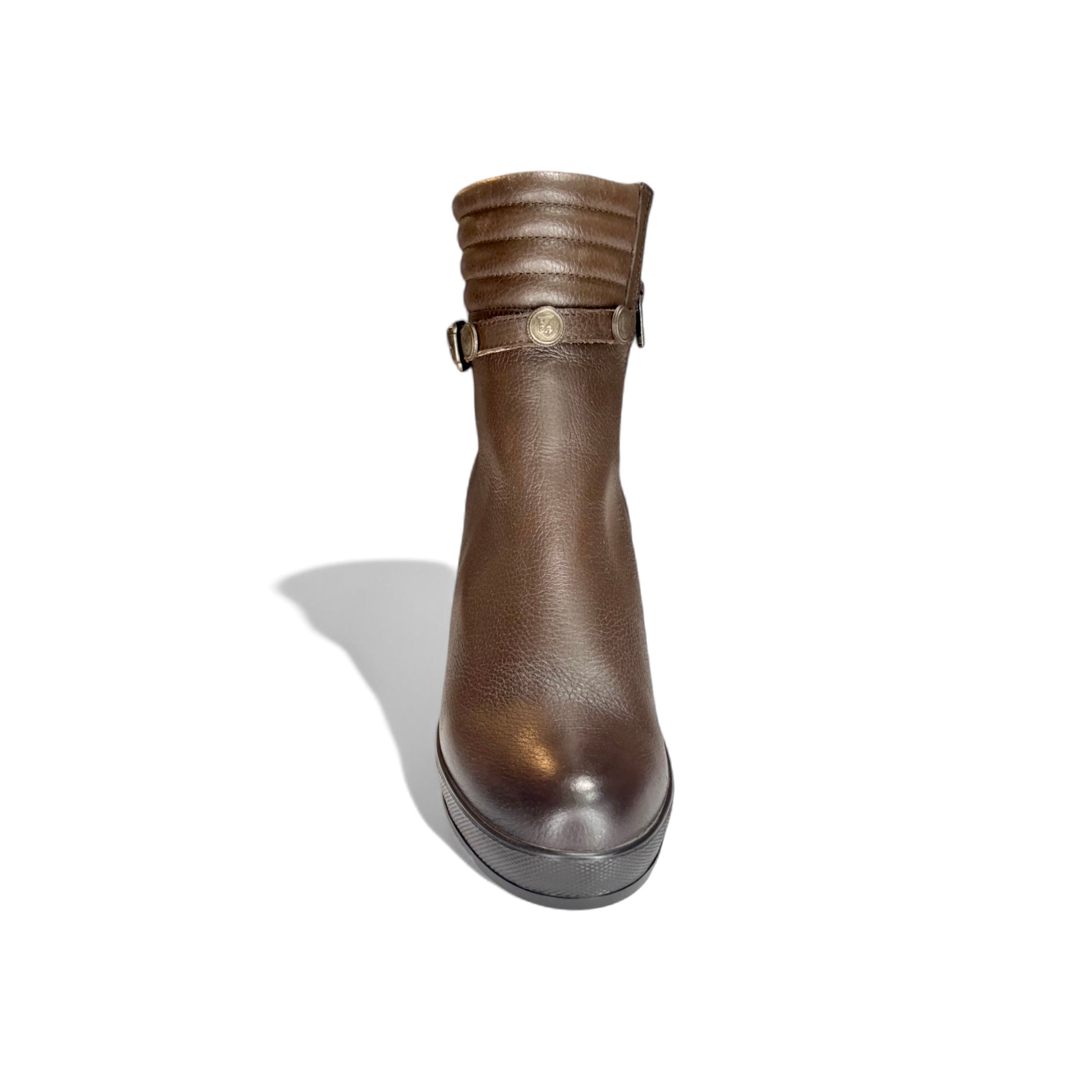 Bota corta color café de piel sintética con tacón alto y plataforma ligera. Detalle de hebilla dorada y costuras decorativas. Estilo elegante y cómodo.