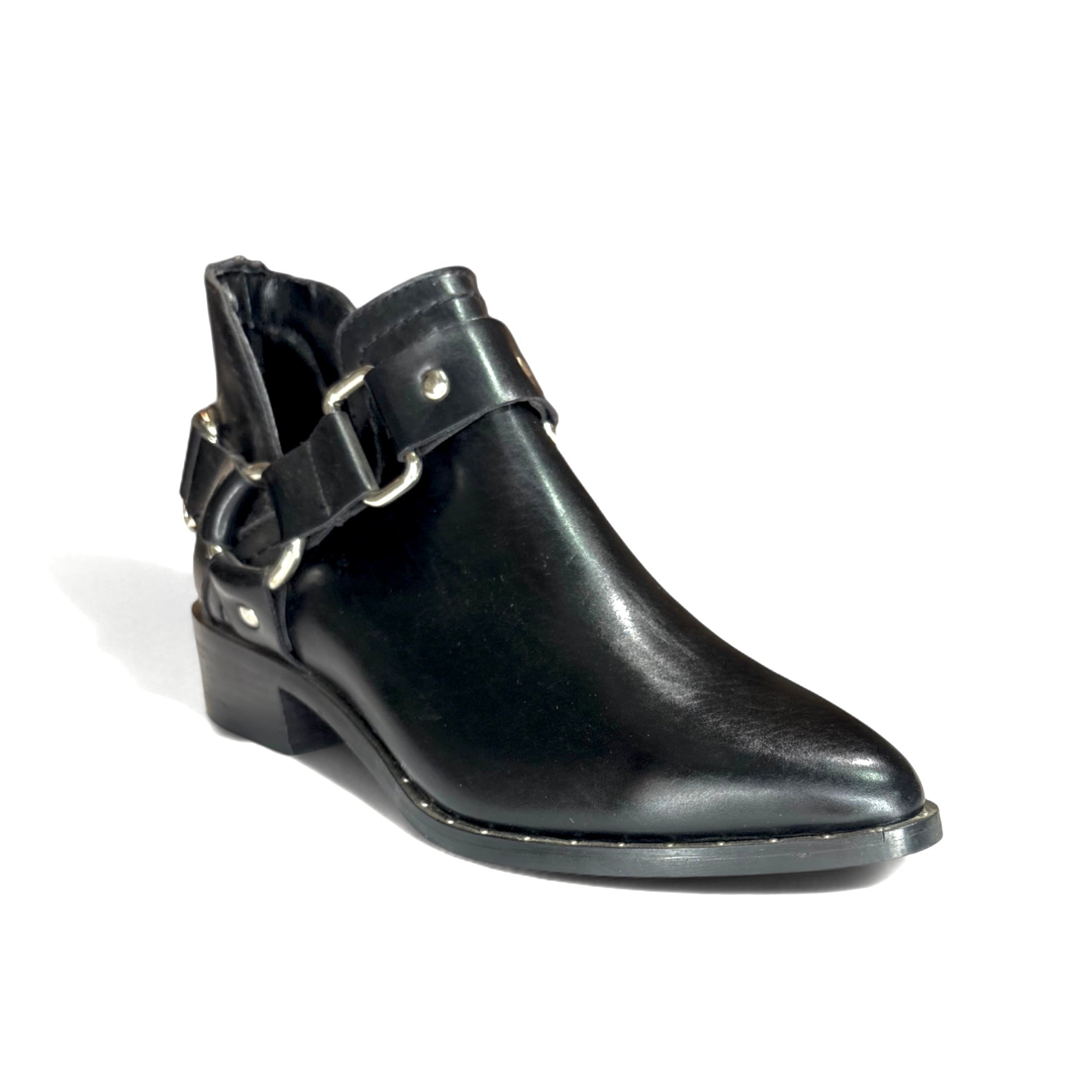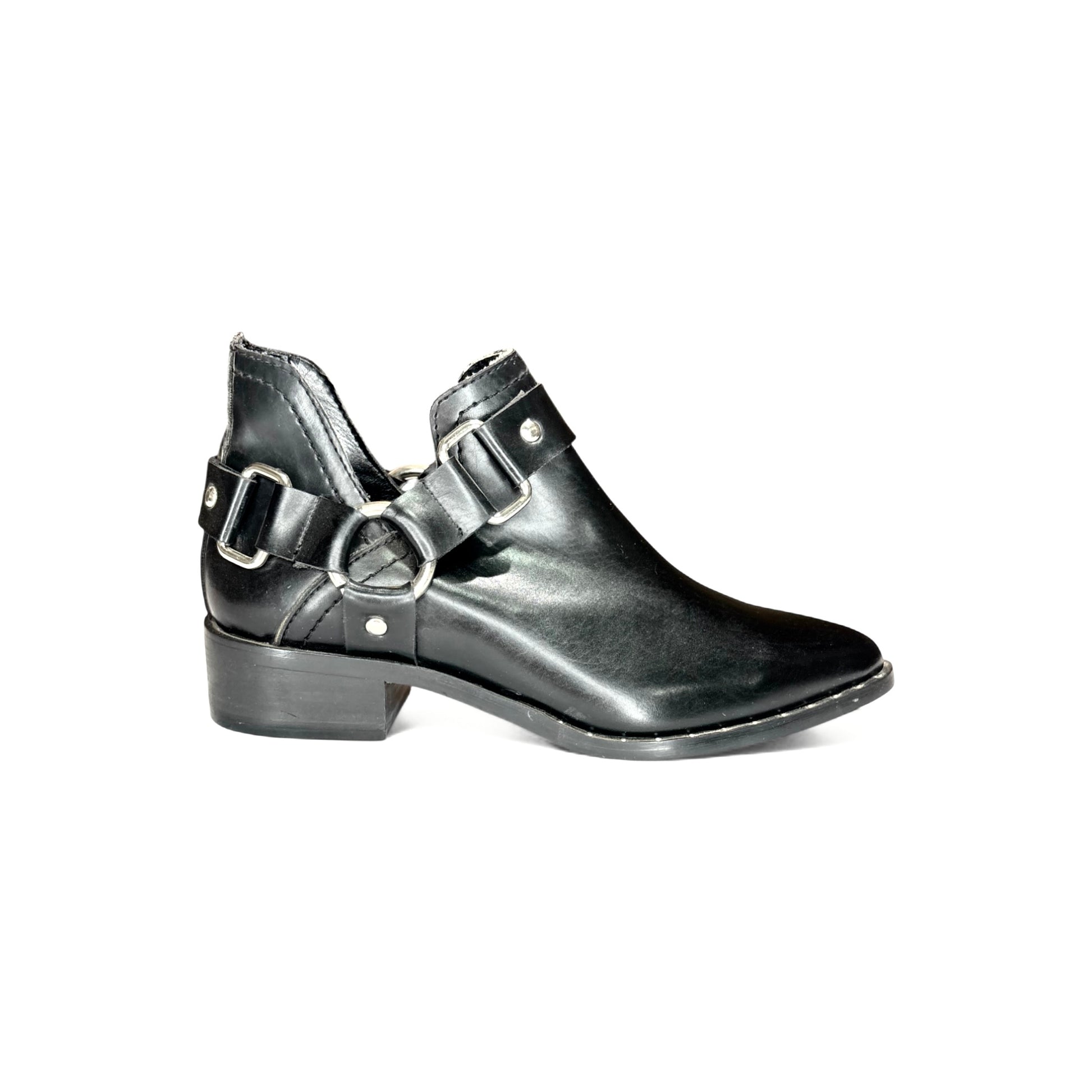 Atrévete a lucir un estilo moderno con este botín negro tipo biker, diseñado con hebillas metálicas y tacón bajo. Ideal para crear outfits urbanos con un toque rebelde.
