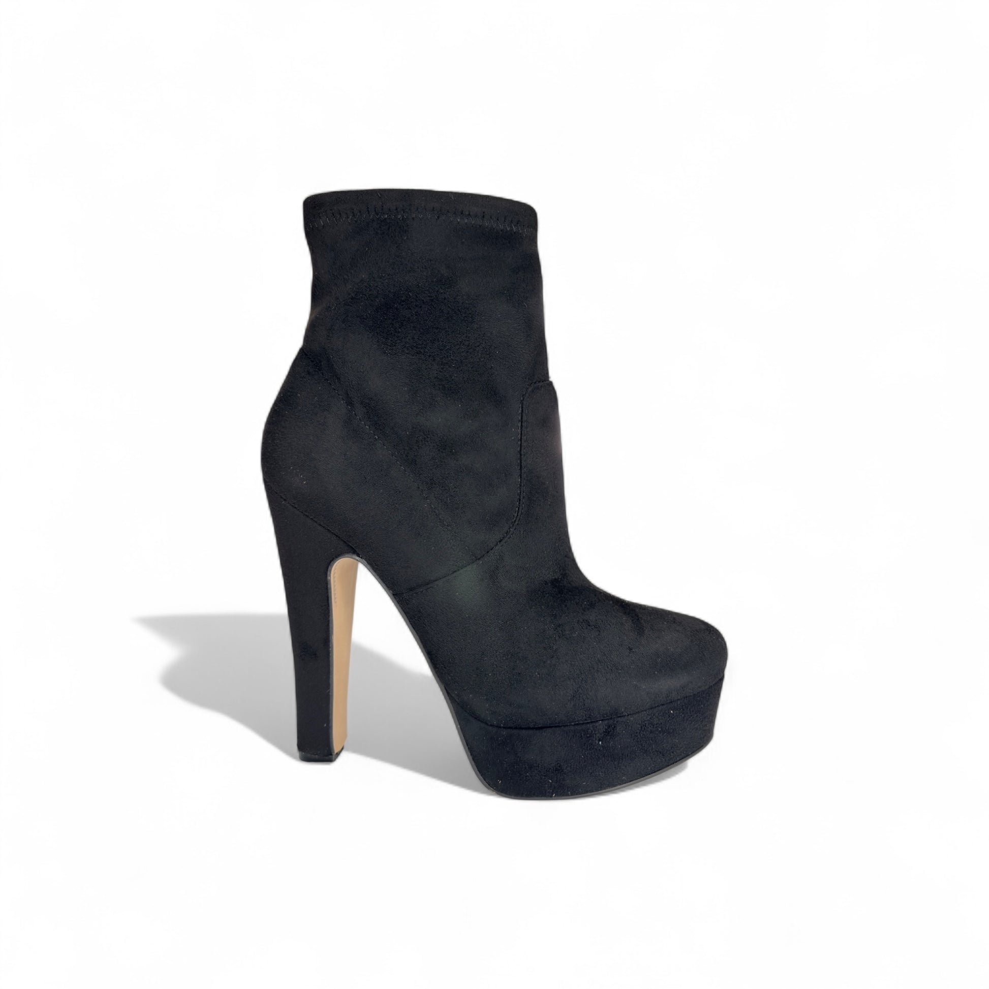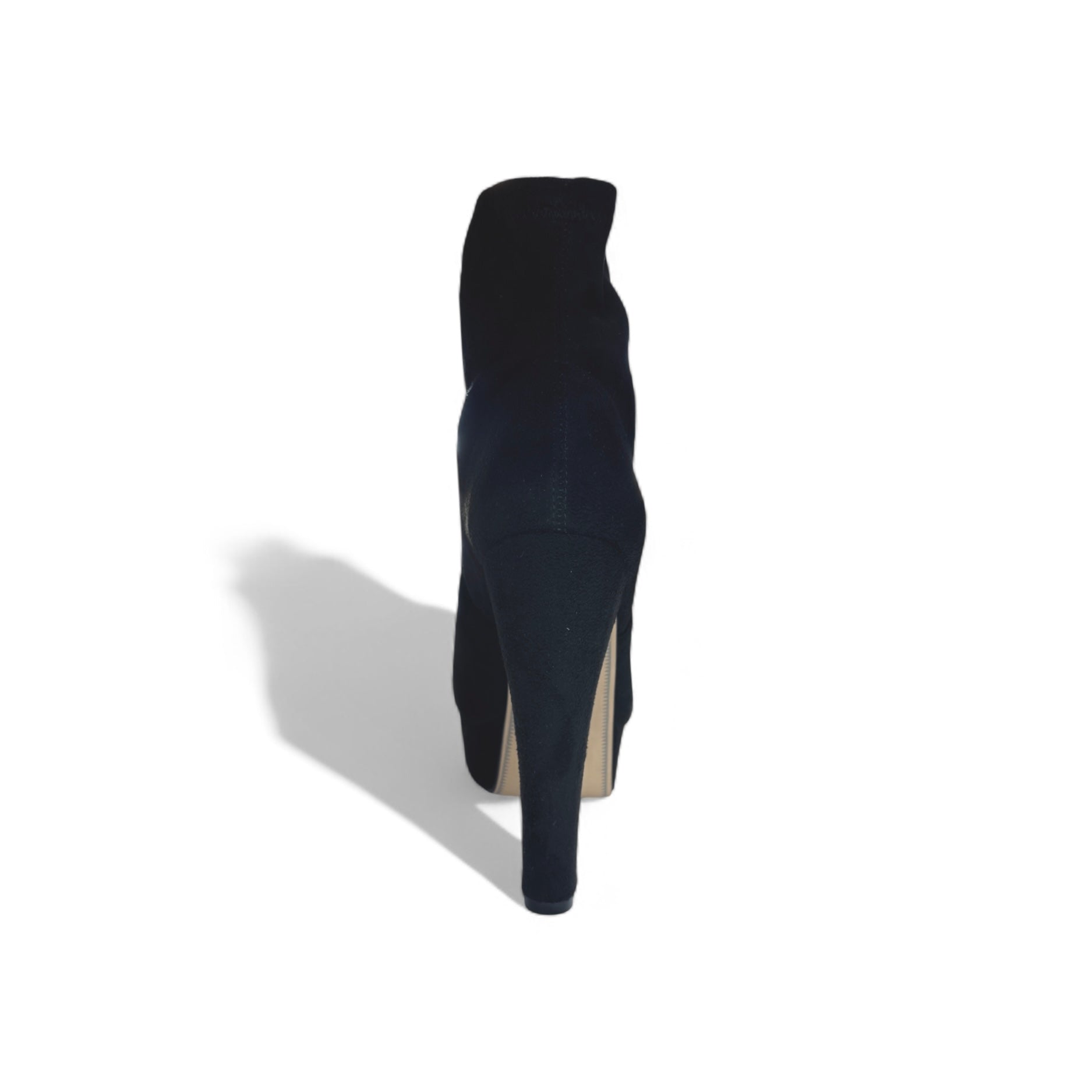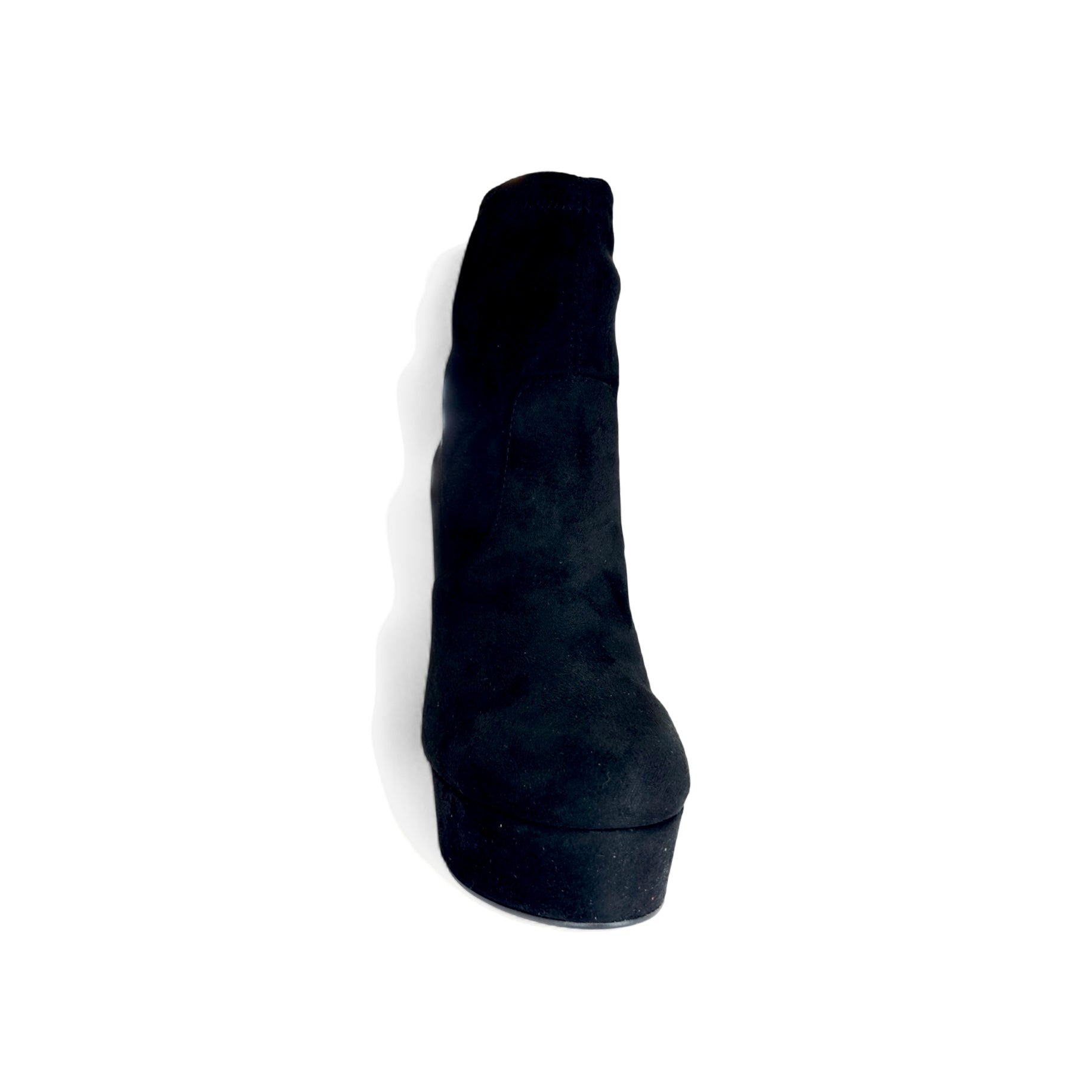 Botín negro con plataforma y tacón alto para mujer, ideal para realzar tu estilo con elegancia y sofisticación. Fabricado en acabado tipo gamuza, se ajusta al tobillo para estilizar la figura y brindar soporte. Perfecto para eventos de noche, fiestas o salidas especiales.