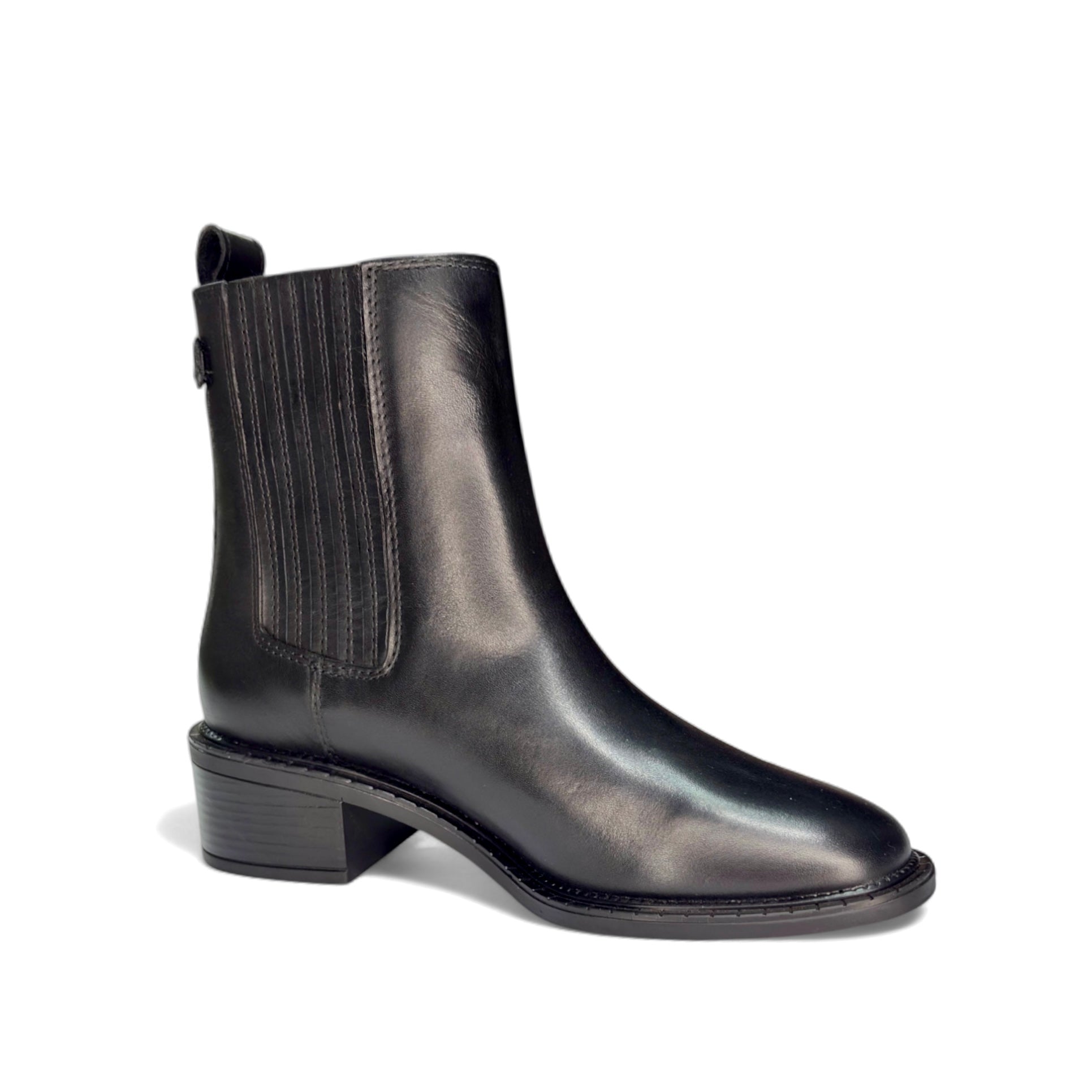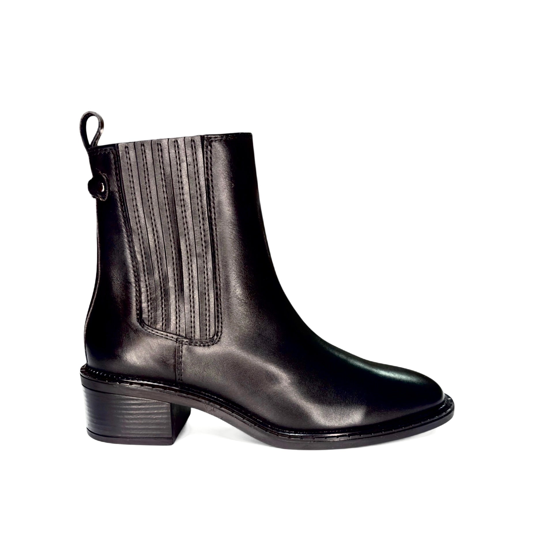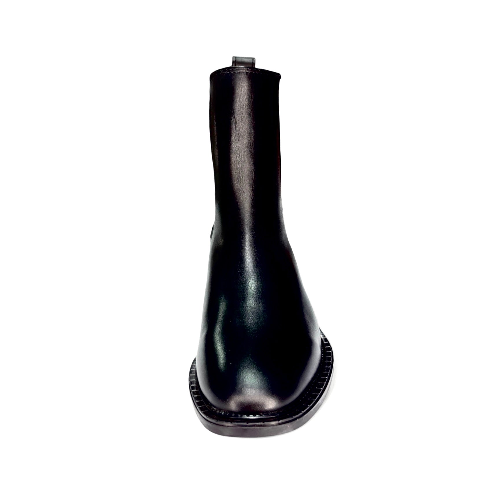 Botín negro tipo Chelsea con elástico lateral y tacón bajo. Versátil, elegante y cómodo para uso diario. 100% piel