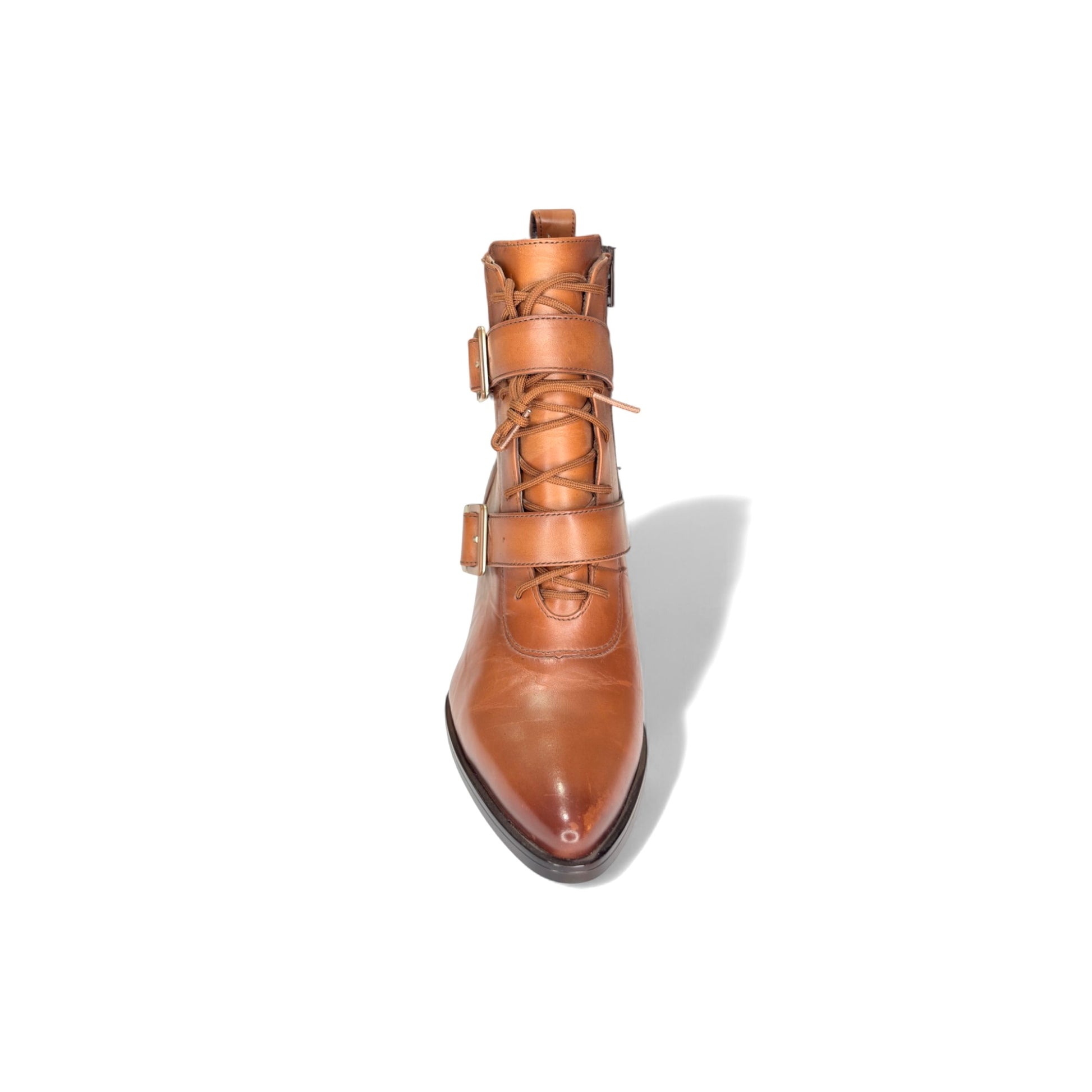 “Botín camel con tacón medio, cordones y hebillas metálicas. Estilo urbano y sofisticado para realzar cualquier look.”