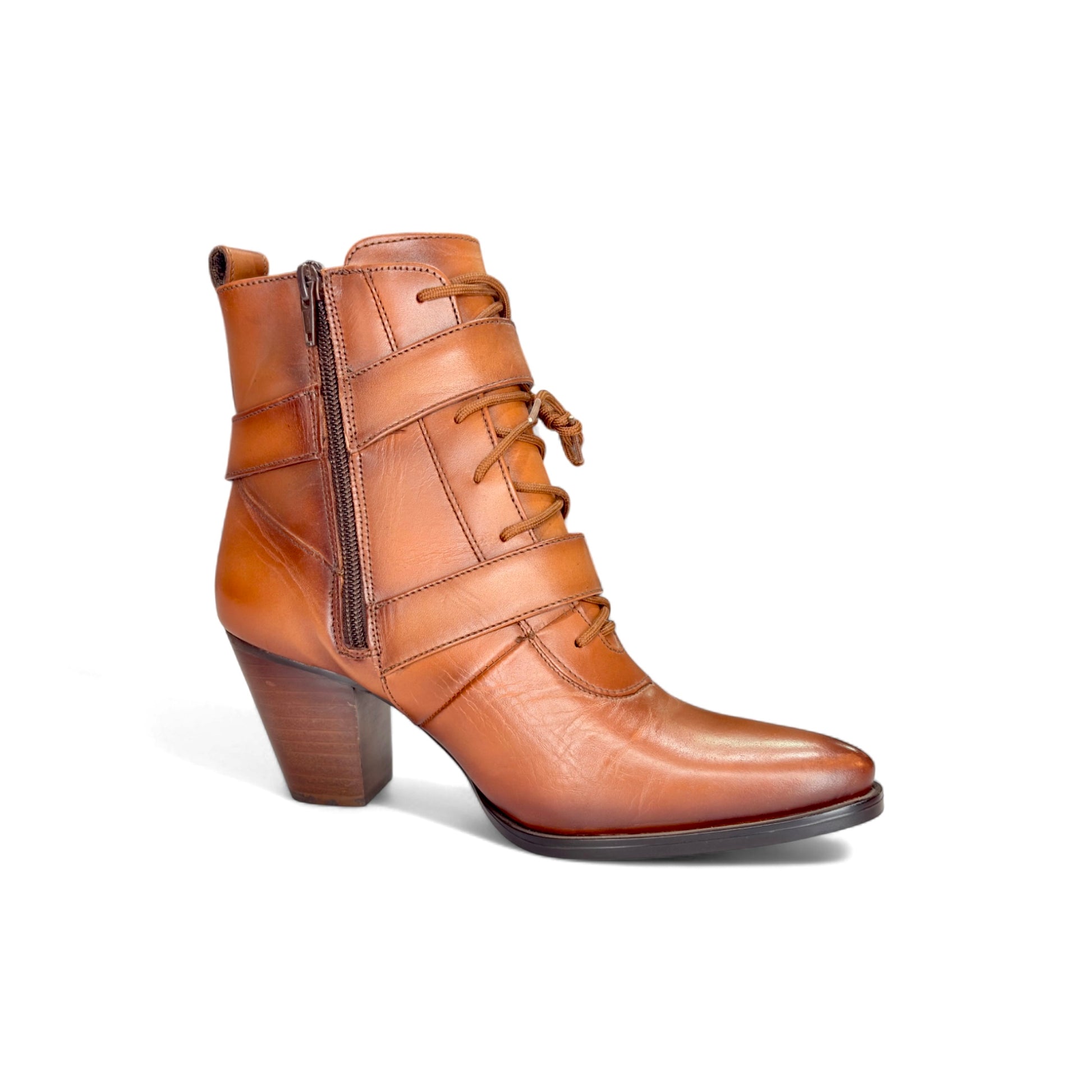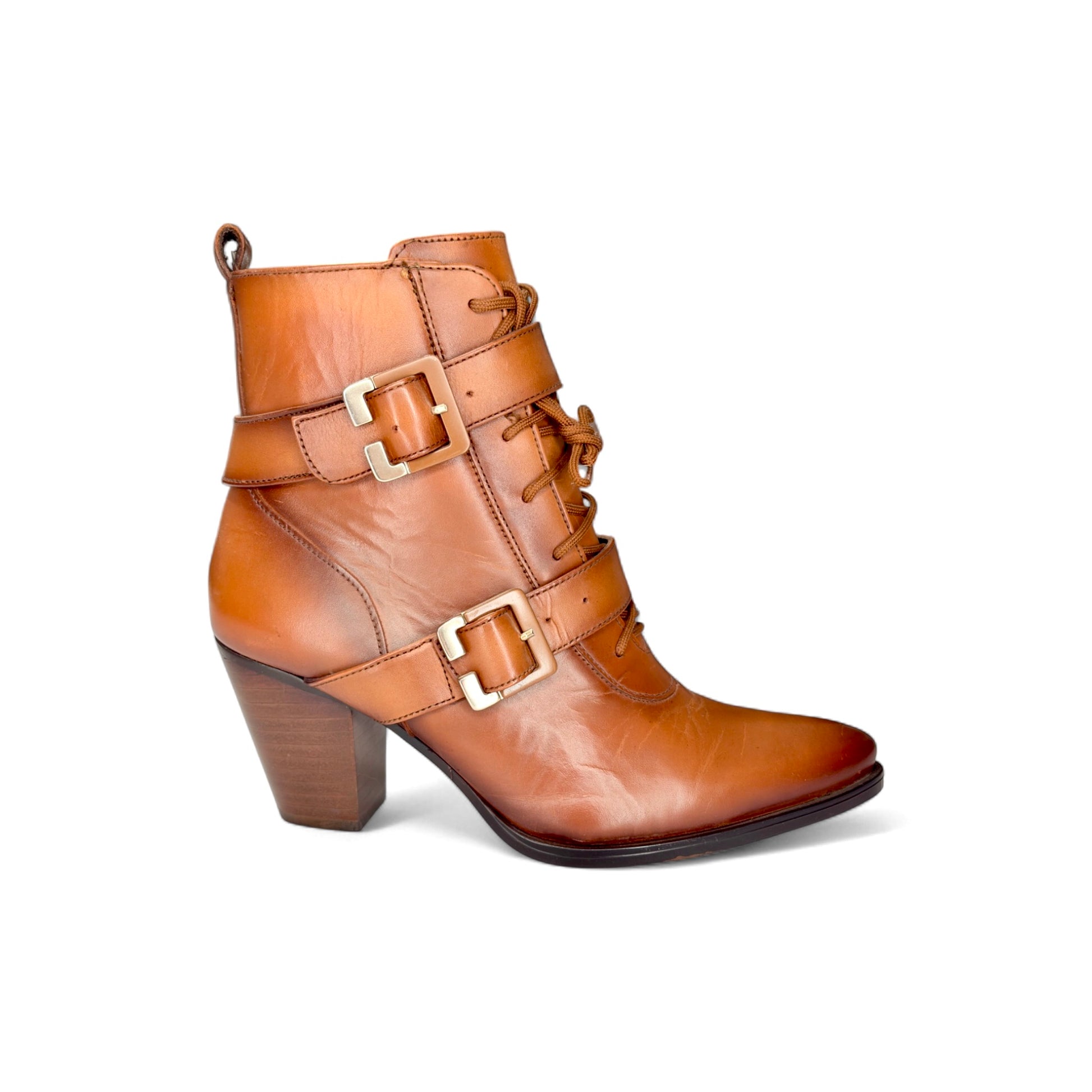 Elaborado 100% de piel una de las mejores marcas de calzado mexicano. Botín camel con tacón y hebillas (mujer)
