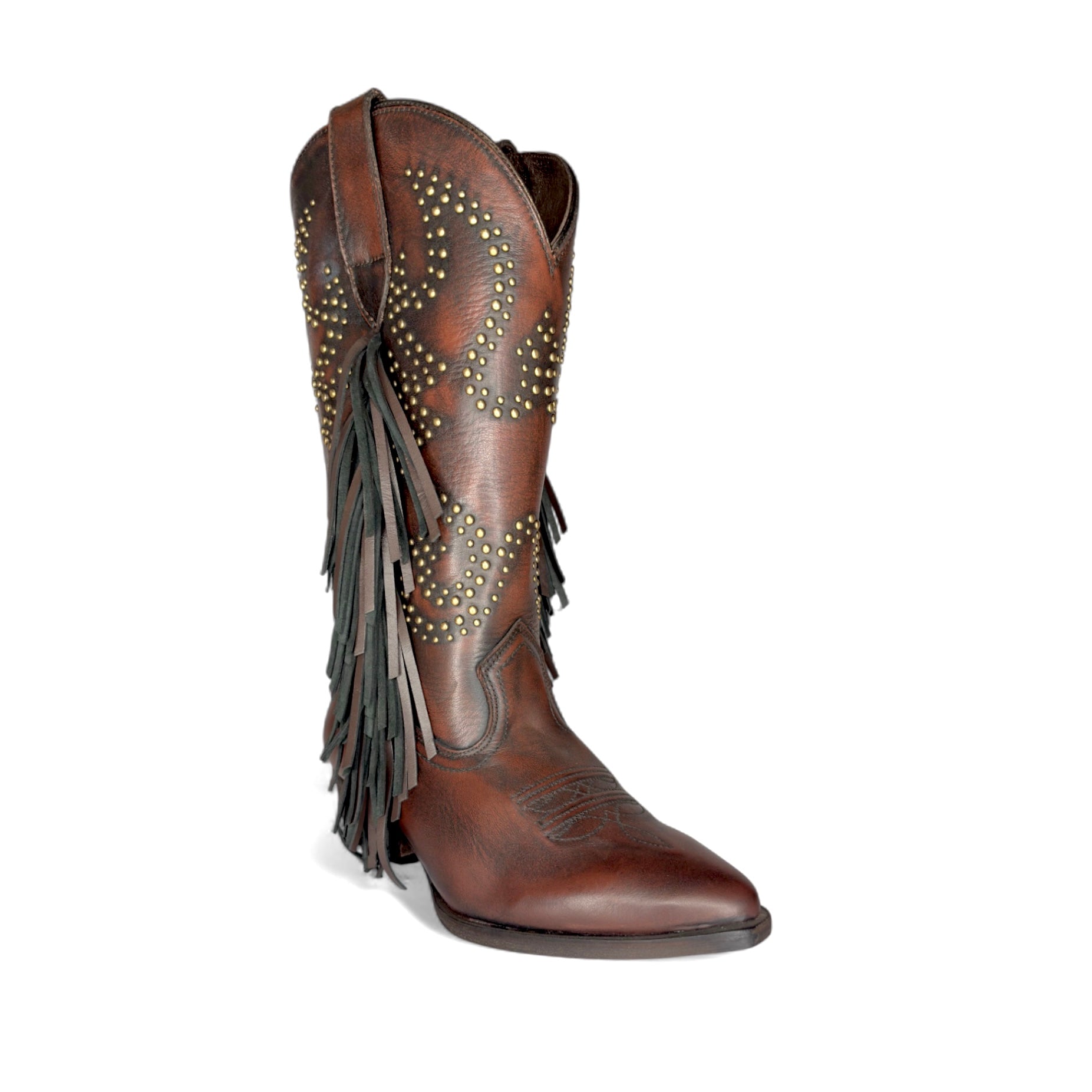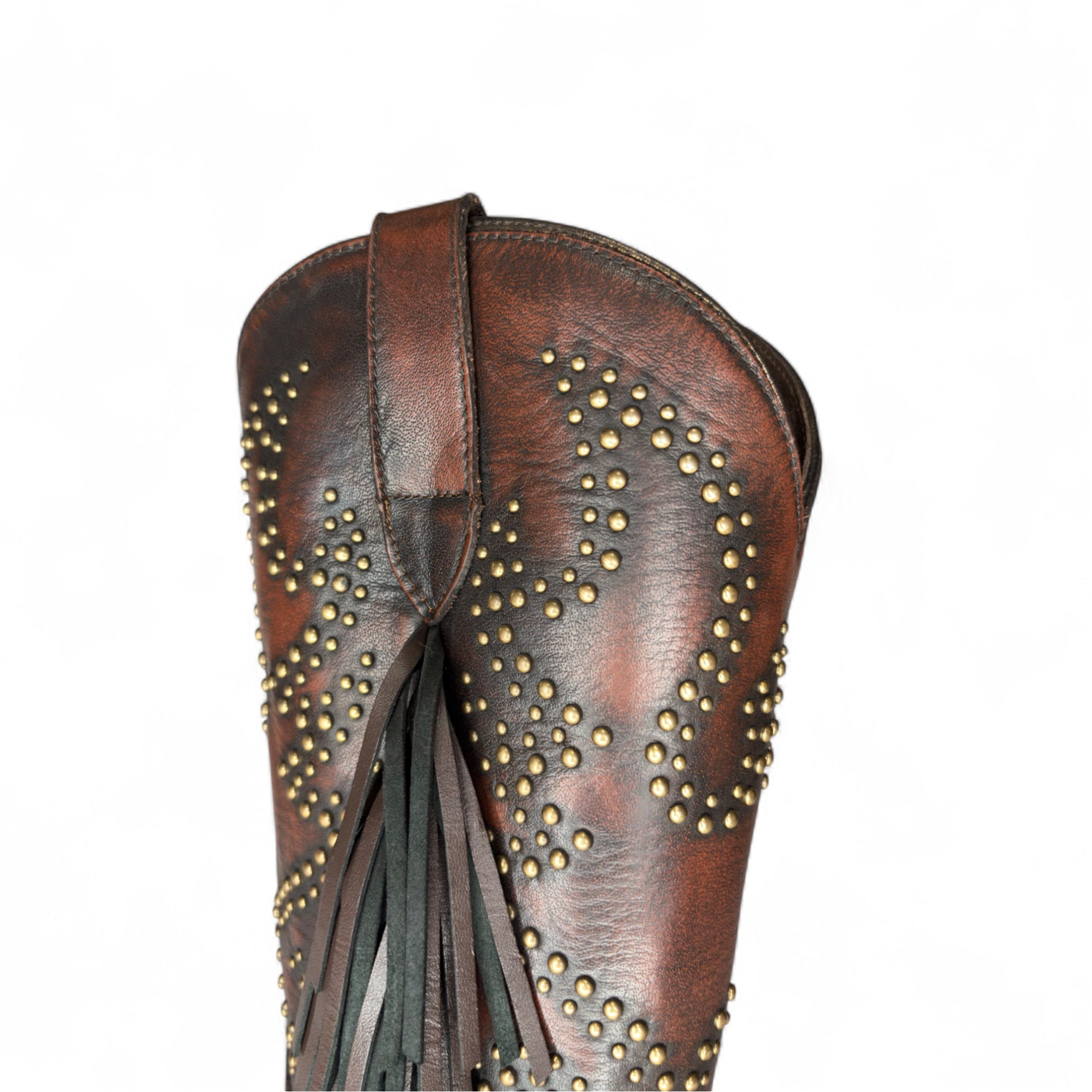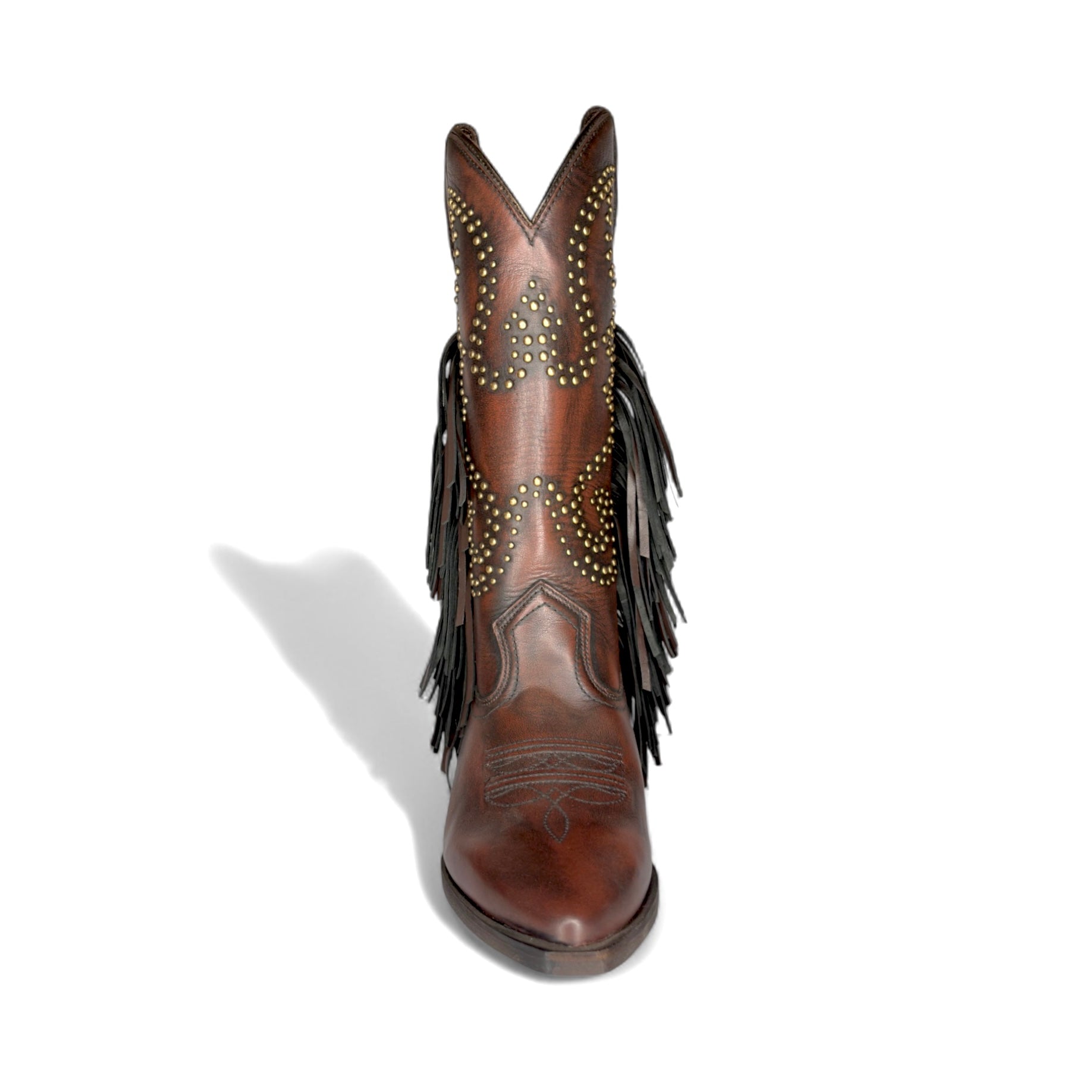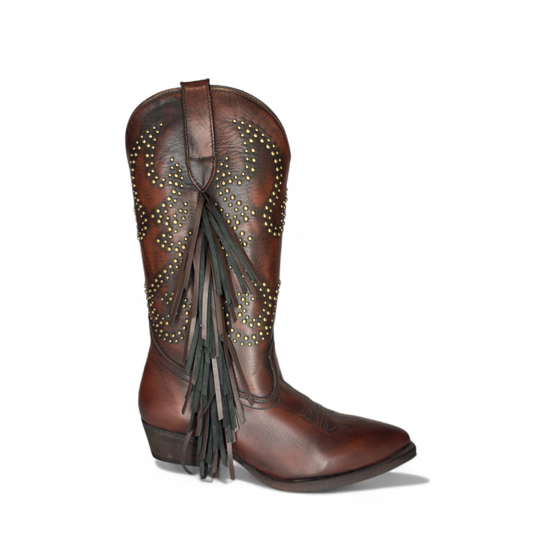 Bota de piel genuina en color café, con tachas doradas decorativas y correa con hebilla metálica. Tacón ancho y alto que brinda estilo western moderno con comodidad.