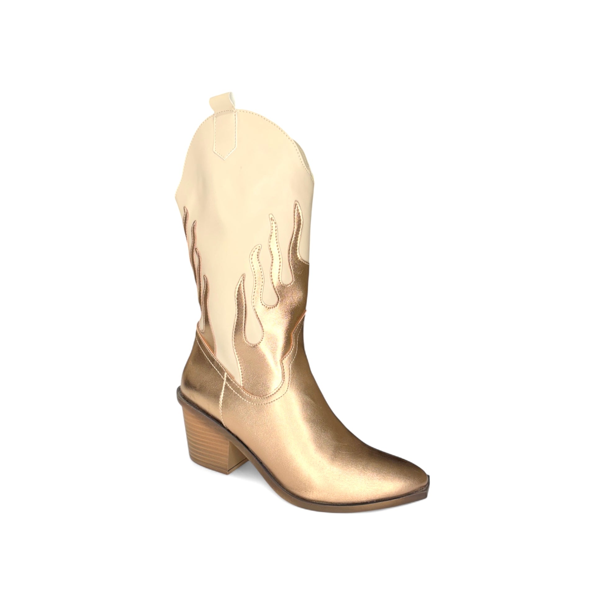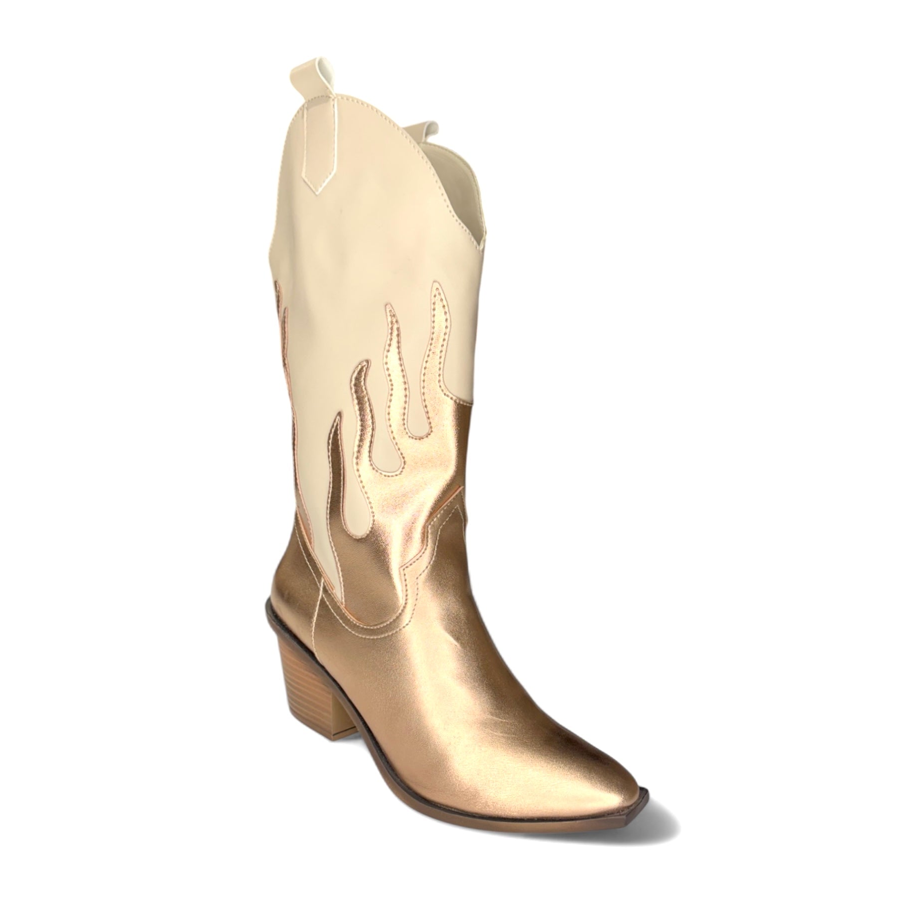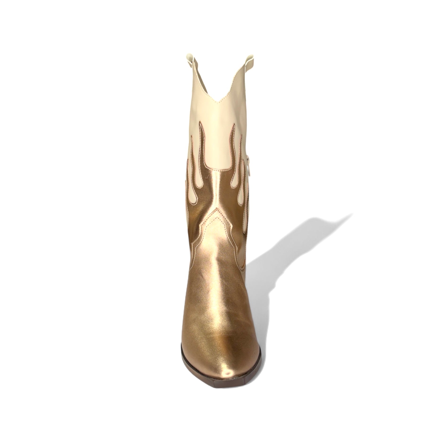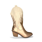 Atrévete a brillar con esta bota vaquera dorada con diseño de llamas. Su estilo western moderno y acabado metálico la convierten en el complemento perfecto para conciertos, fiestas o street style. Con tacón cómodo y detalles únicos, es la bota que hará destacar tu look en cualquier ocasión.