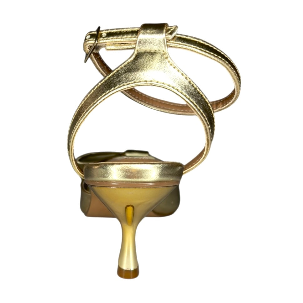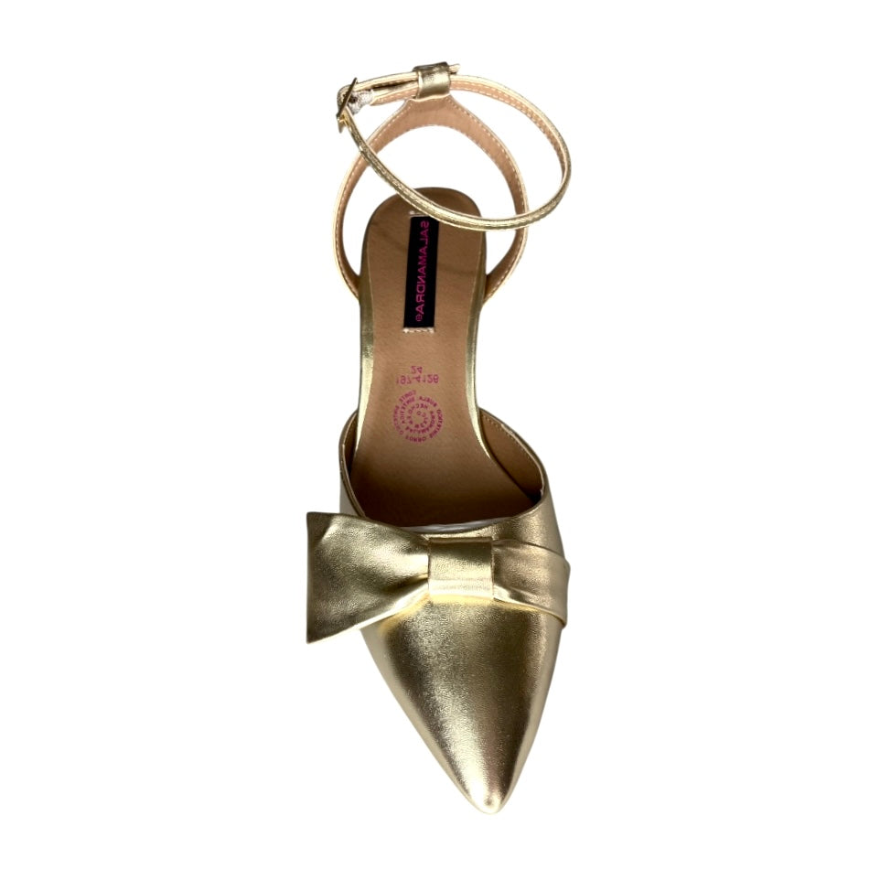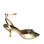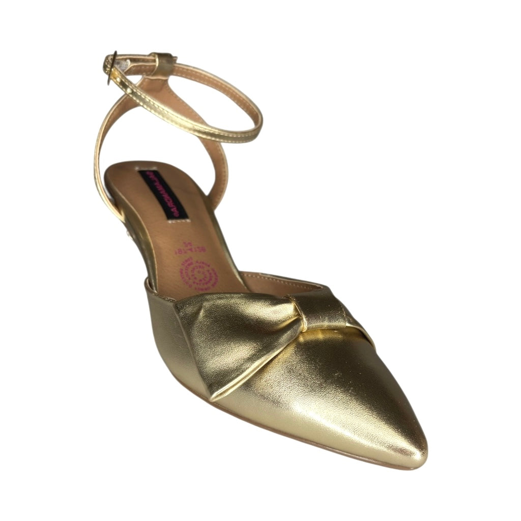 Este elegante zapato de tacón en tono dorado es ideal para lucir sofisticada sin renunciar a la comodidad. Su diseño de punta fina estiliza el pie, mientras que el moño decorativo en la parte frontal añade un toque femenino y coqueto. Cuenta con pulsera ajustable al tobillo para mayor seguridad y un tacón medio delgado que brinda altura con estabilidad. Perfecto para eventos de noche, bodas o cualquier ocasión especial.