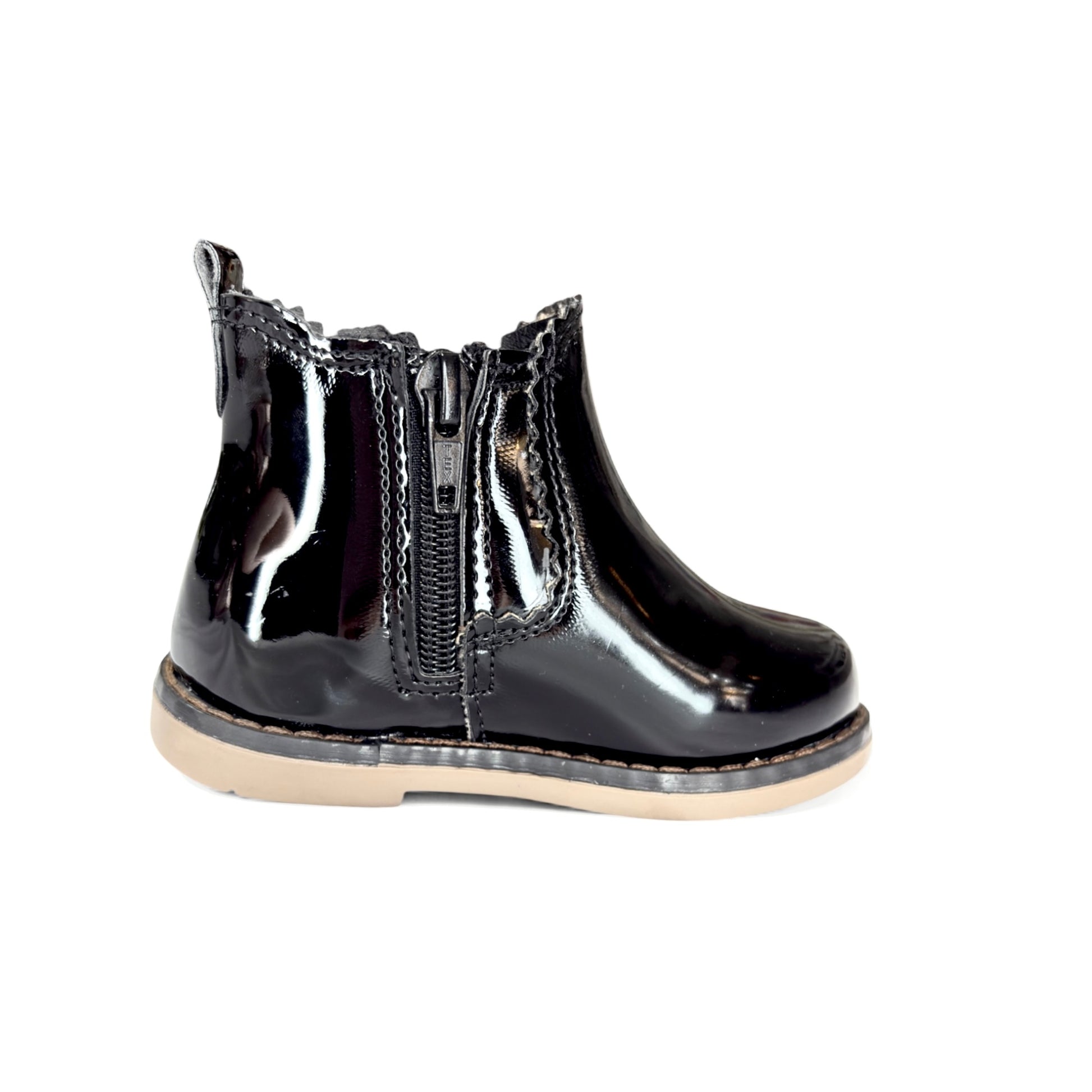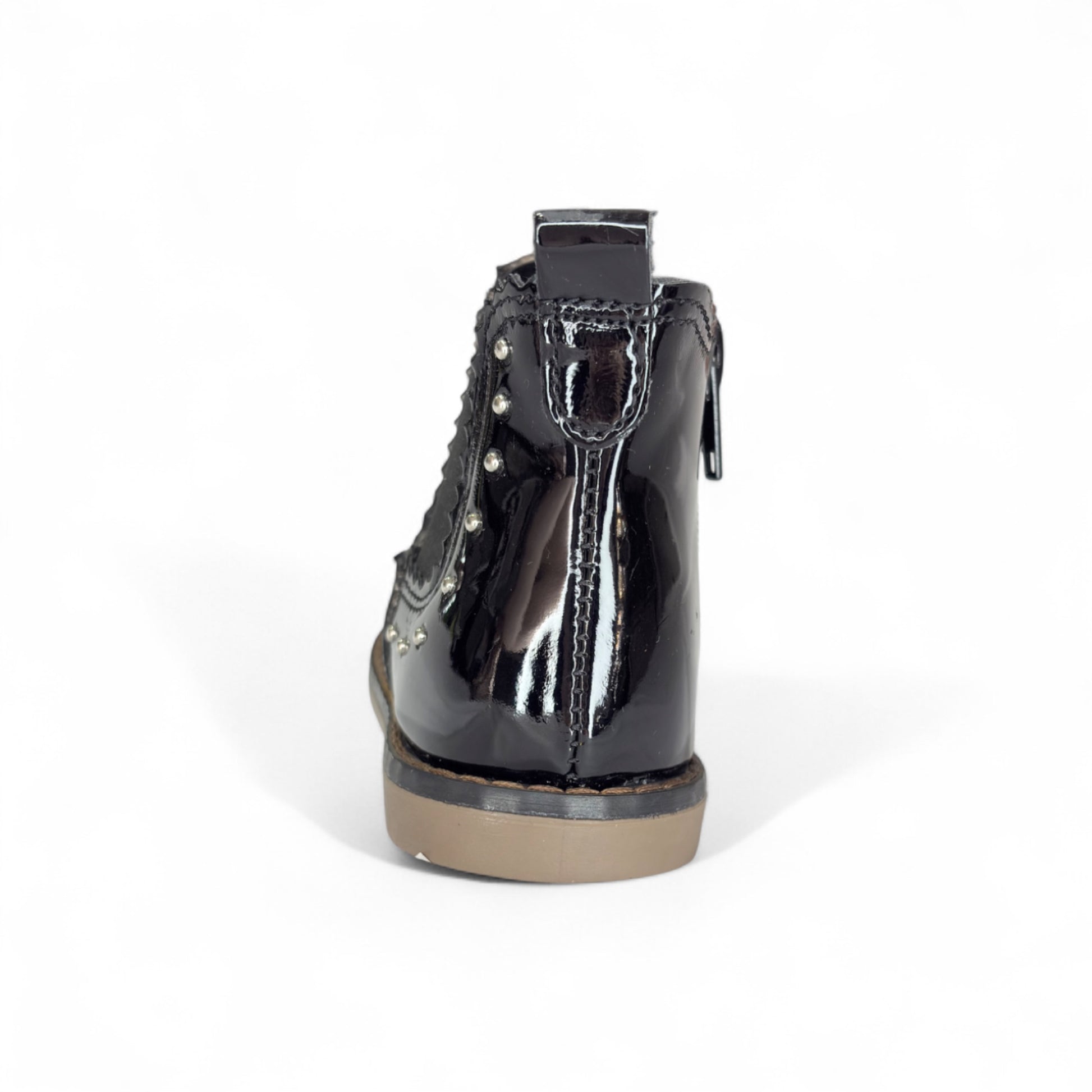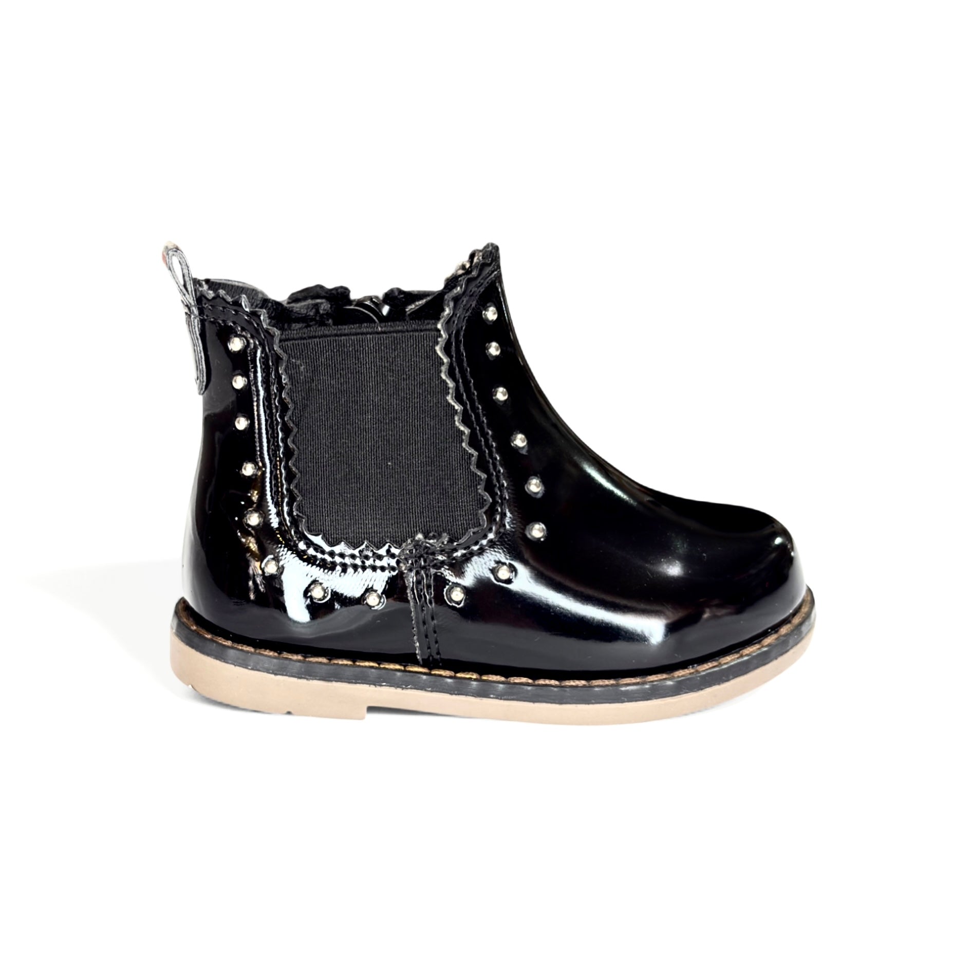 “Botín de charol negro para niña, con elástico lateral y detalles metálicos que le dan un toque moderno y elegante. Ideal para looks de temporada.”