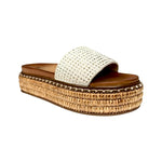 Dale un toque bohemio y chic a tu look con esta sandalia de plataforma tipo yute. Su diseño combina una base tejida de estilo artesanal con una banda superior en color blanco decorada con pequeños brillos que aportan un sutil destello. Perfectas para un outfit casual con estilo, son cómodas, ligeras y muy versátiles. ¡Ideales para primavera y verano!