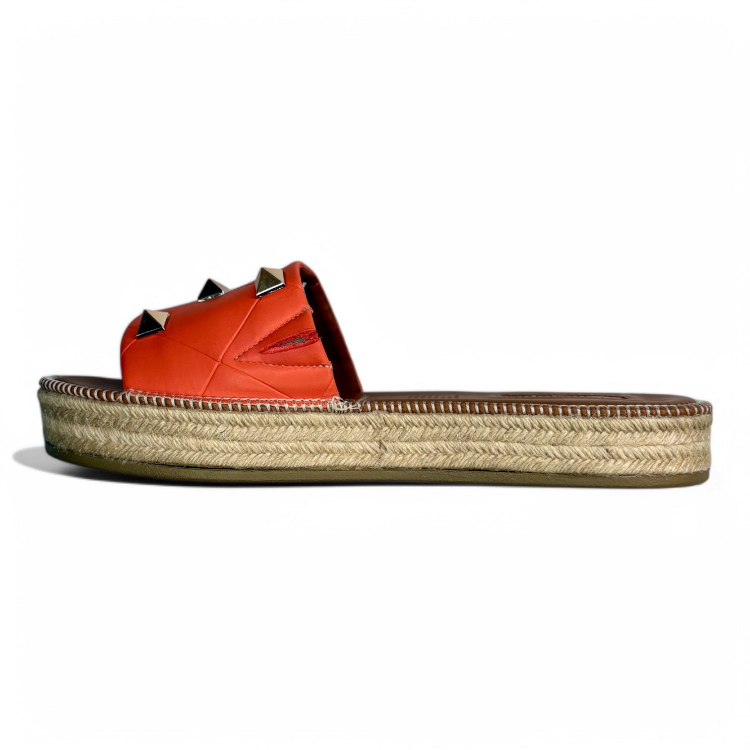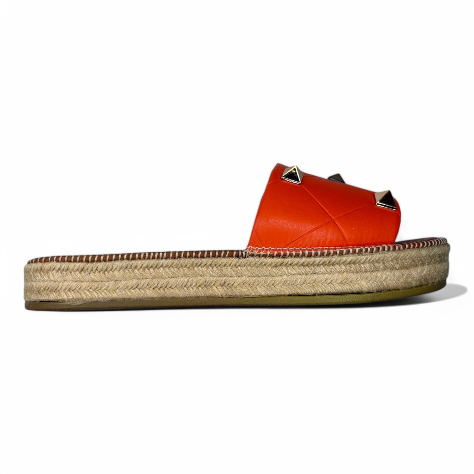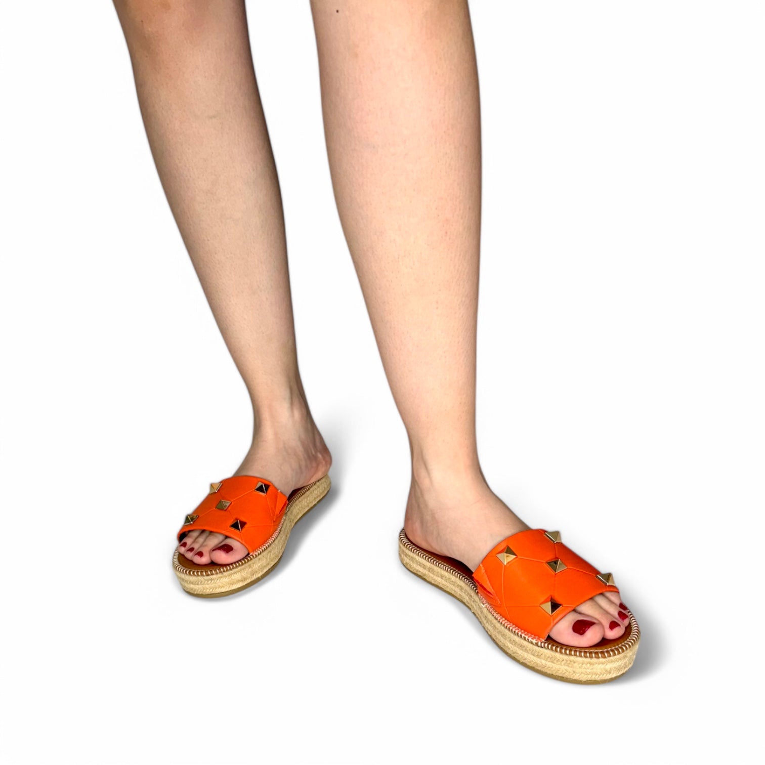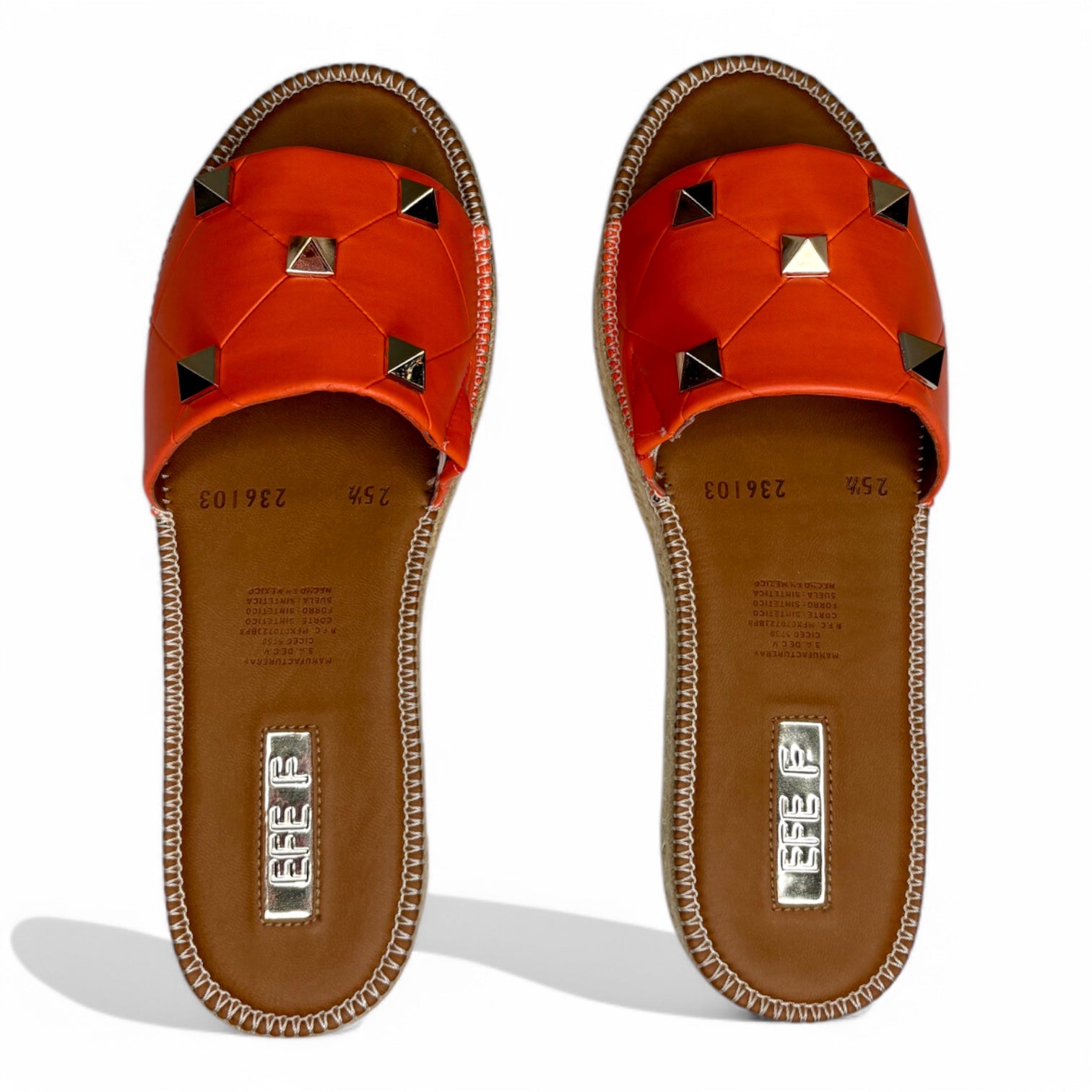 Atrévete a destacar con esta sandalia en naranja brillante, perfecta para darle vida a cualquier look. Su diseño incluye detalles de estoperoles metálicos que le dan un toque moderno y atrevido, mientras que su ligera plataforma de 5 cm forrada en yute natural aporta ese estilo fresco y bohemio ideal para la temporada. Comodidad, estilo y actitud en un solo par.