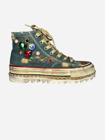 Atrévete a romper las reglas con los Denim Rebel de Nicole, un modelo tipo Converse en versión botita, confeccionado en mezclilla y decorado con piedras de la más alta calidad. Su diseño único simula un acabado desgastado o “roto”, que le da ese toque rebelde y moderno que marca la diferencia.
