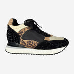 Estos tenis de diseño moderno destacan por su combinación de texturas y colores en tonos neutros con detalles en animal print, que aportan un aire audaz y sofisticado. La parte delantera y trasera está decorada con brillos sutiles, añadiendo un toque de glamour sin perder su estilo casual.