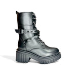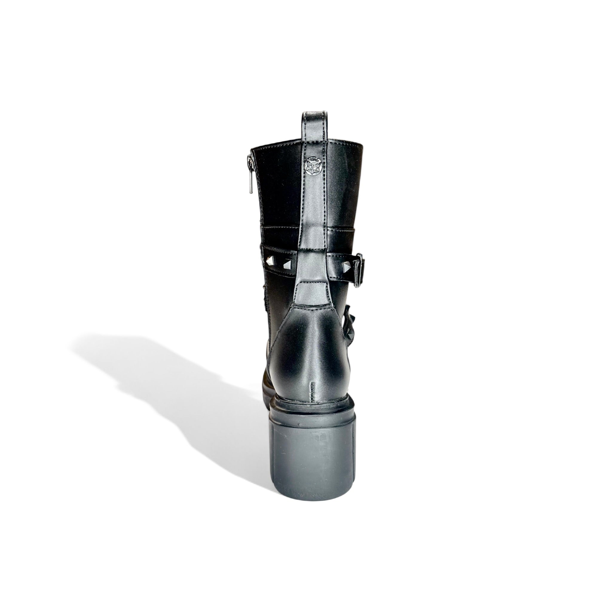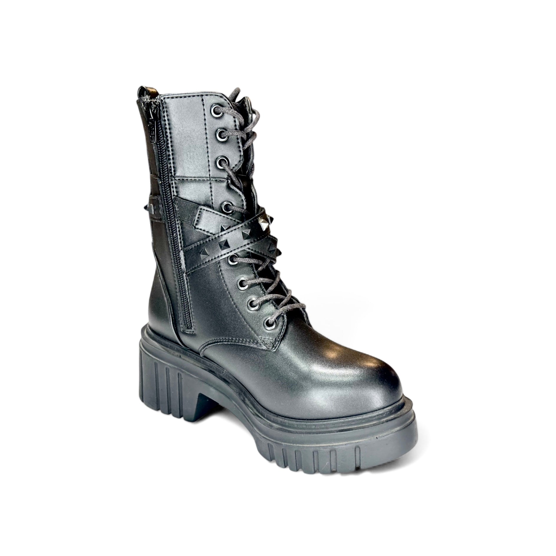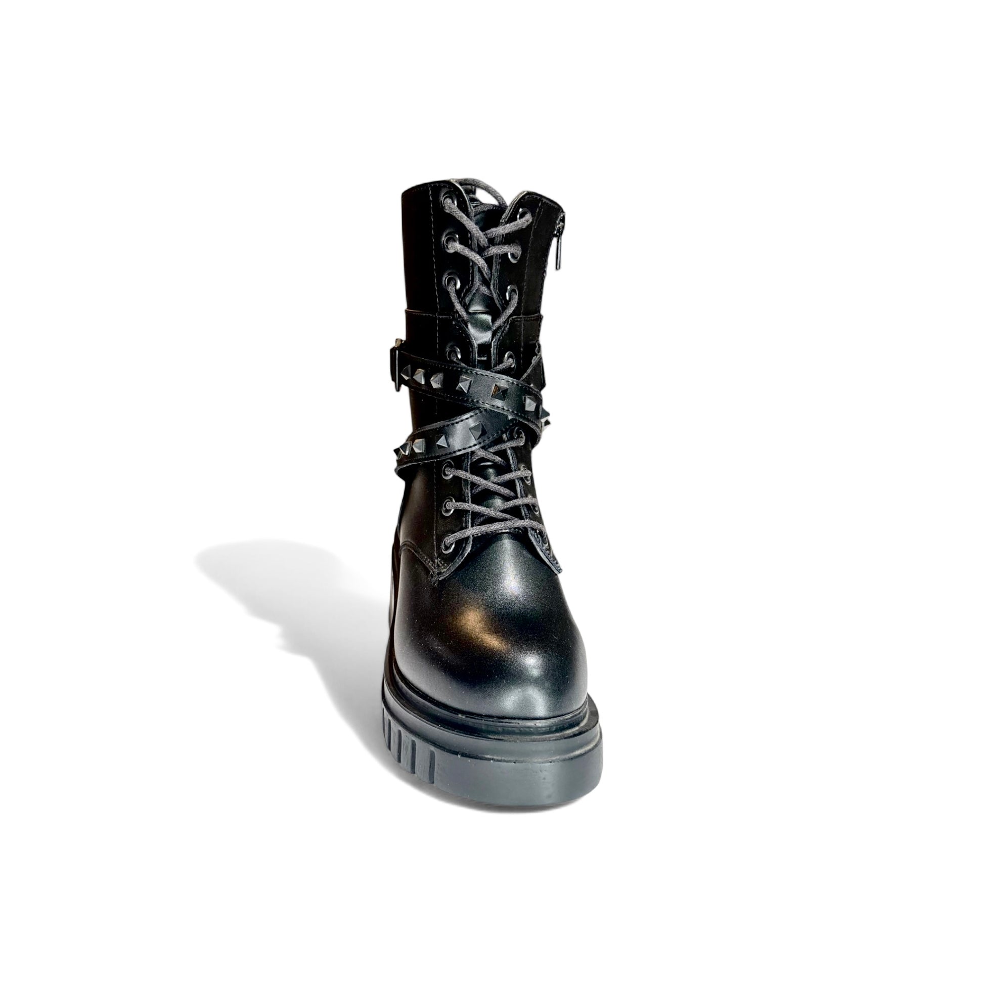 Bota negra tipo combat con plataforma gruesa, cordones y doble correa con estoperoles. Un look edgy y urbano.