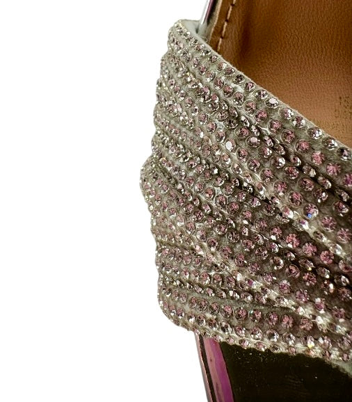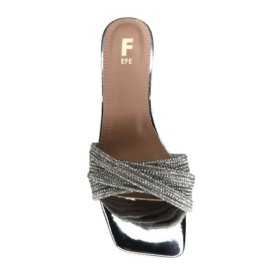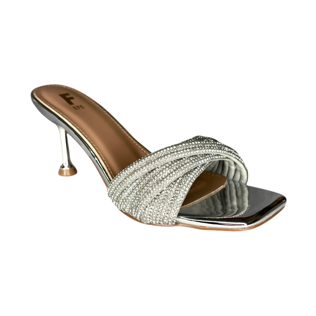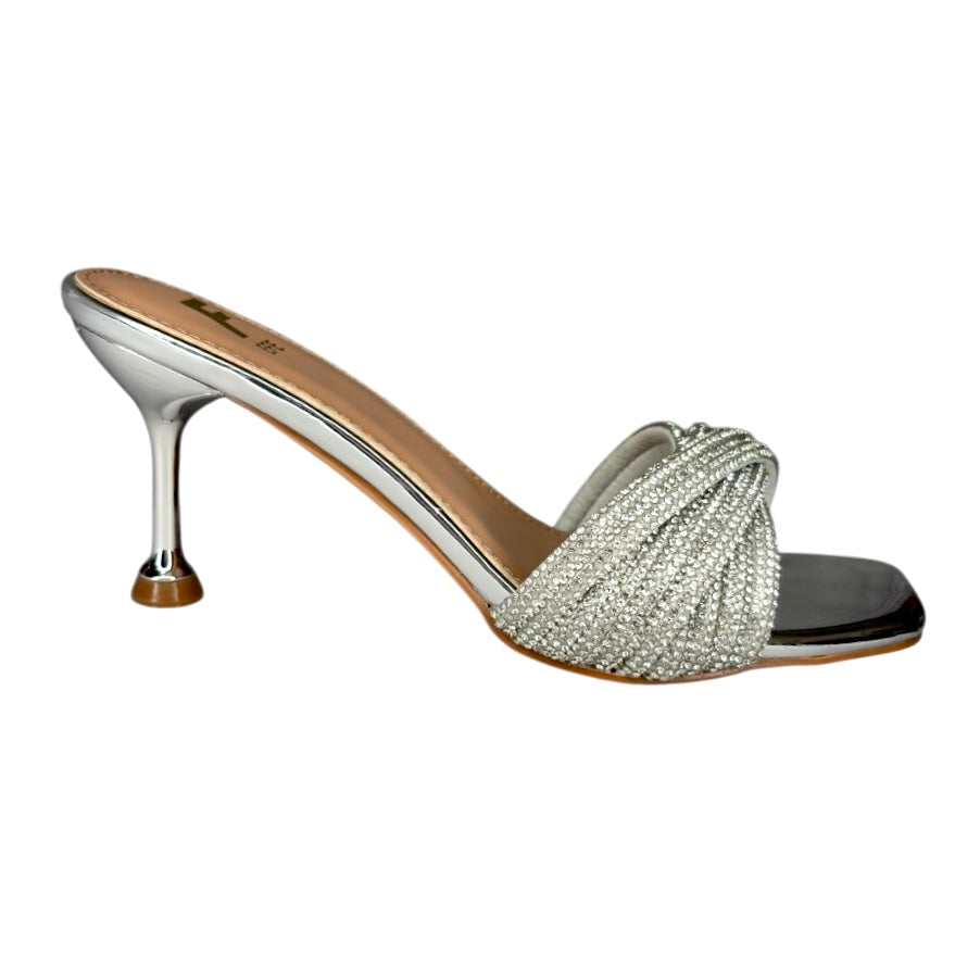 Este glamuroso mule de tacón es el equilibrio perfecto entre elegancia y sofisticación. Su diseño destaca por un cruzado de tiras en el empeine, cubiertas de finos cristales brillantes que atrapan la luz con cada paso. El acabado metálico cromado en la suela y el tacón delgado le dan un toque moderno y vanguardista. Ideal para eventos de noche, fiestas o cualquier ocasión en la que quieras robar miradas con estilo.