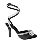 Dale un toque de glamour a tu look con estas espectaculares sandalias de tacón. Confeccionadas en satín negro, destacan por su diseño sofisticado y su tira enroscada adornada con pedrería brillante que se ajusta elegantemente al tobillo. La parte frontal luce un doble aro de cristales que aporta un detalle lujoso y femenino. Perfectas para eventos de noche, fiestas o cualquier ocasión especial donde quieras robar miradas.