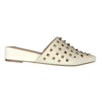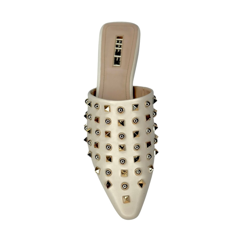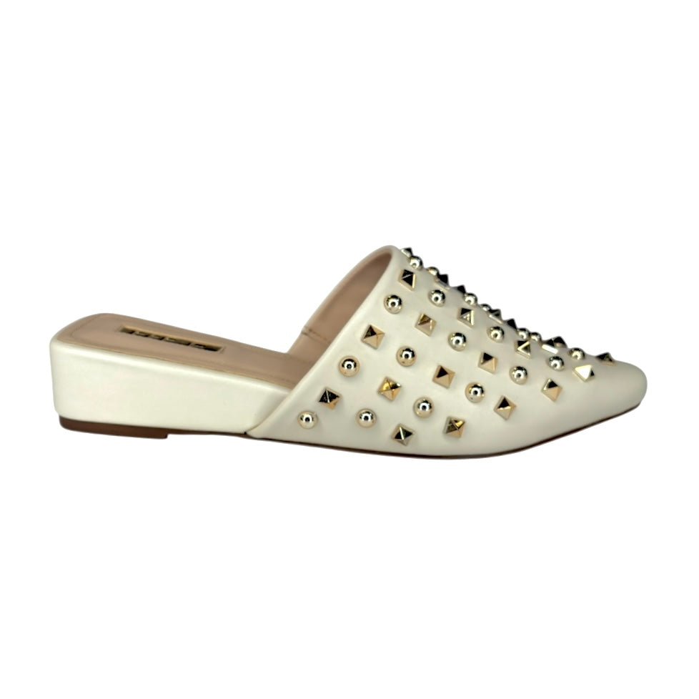 Atrévete a brillar con estilo con los Ivory Stud, unos mules en color blanco hueso con diseño puntiagudo y acabados de piel sintética suave. Su superficie está cubierta con estoperoles metálicos dorados y plateados, creando un contraste moderno, chic y lleno de personalidad.