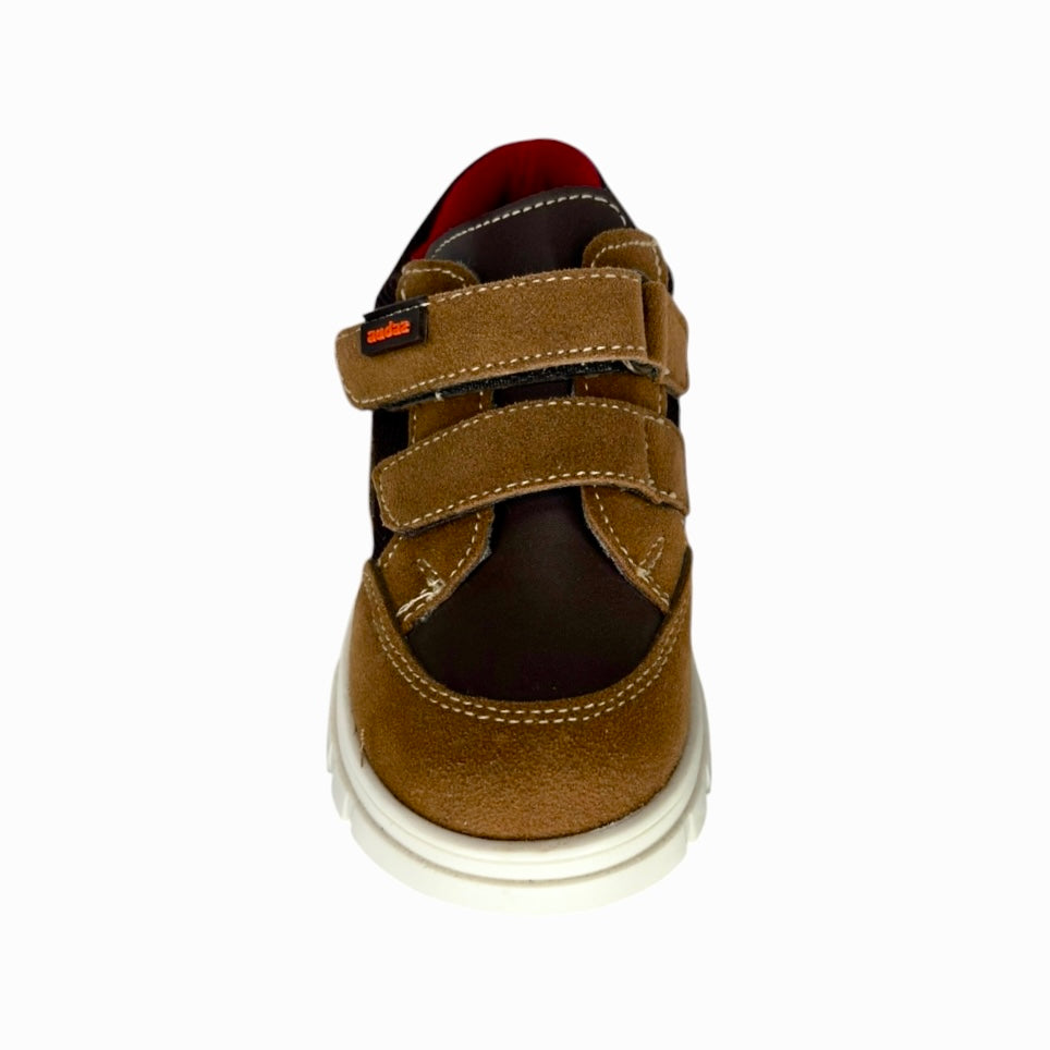 Diseñado para los pequeños exploradores. Este tenis combina materiales resistentes en tonos café, vino y blanco, con detalles de costuras contrastantes que le dan un look moderno y divertido. Su suela blanca dentada ofrece excelente agarre y flexibilidad, ideal para acompañar cada paso con seguridad.