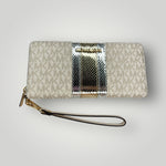 Luce sofisticada con esta cartera original de Michael Kors en tono café, decorada con el clásico estampado de la marca. Su diseño destaca por una franja central en acabado brillante que simula piel de víbora, añadiendo un toque audaz y elegante.