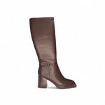 Bota alta sintética color café con tacón ancho y hebilla lateral. Un diseño elegante y versátil que combina estilo y comodidad.