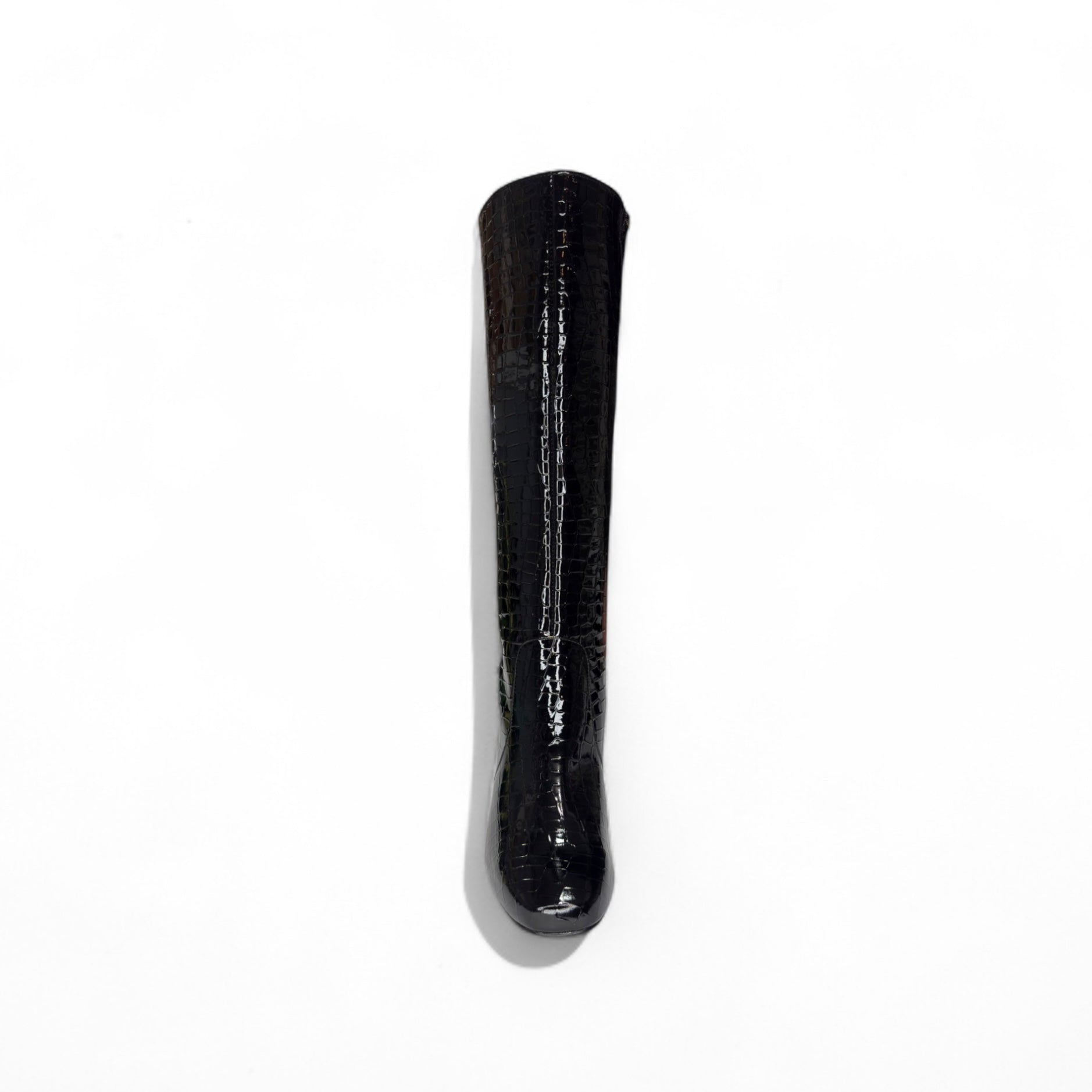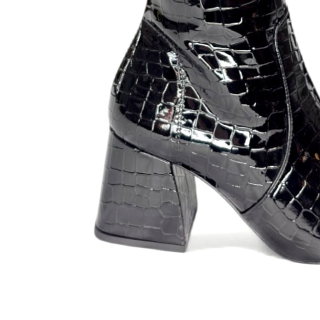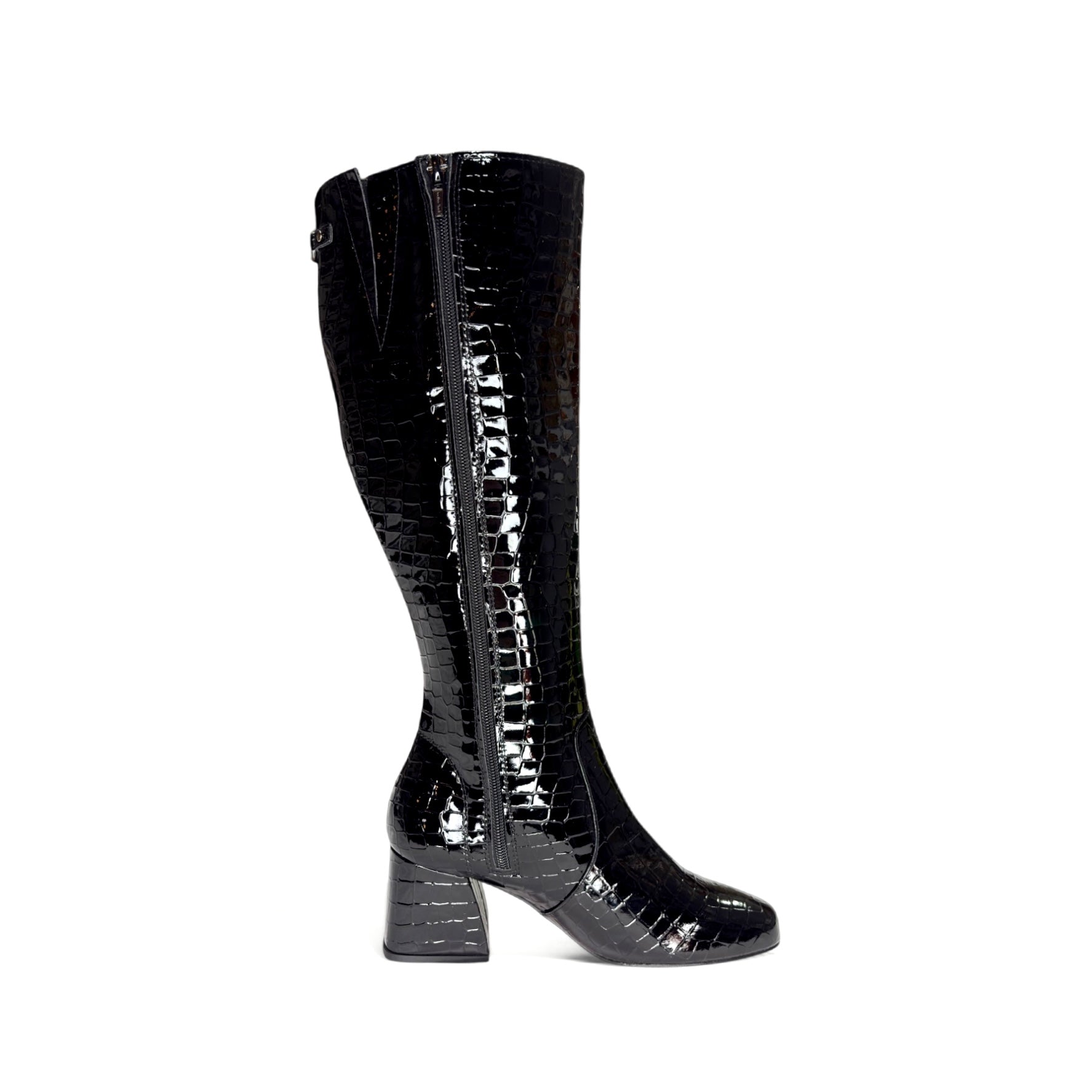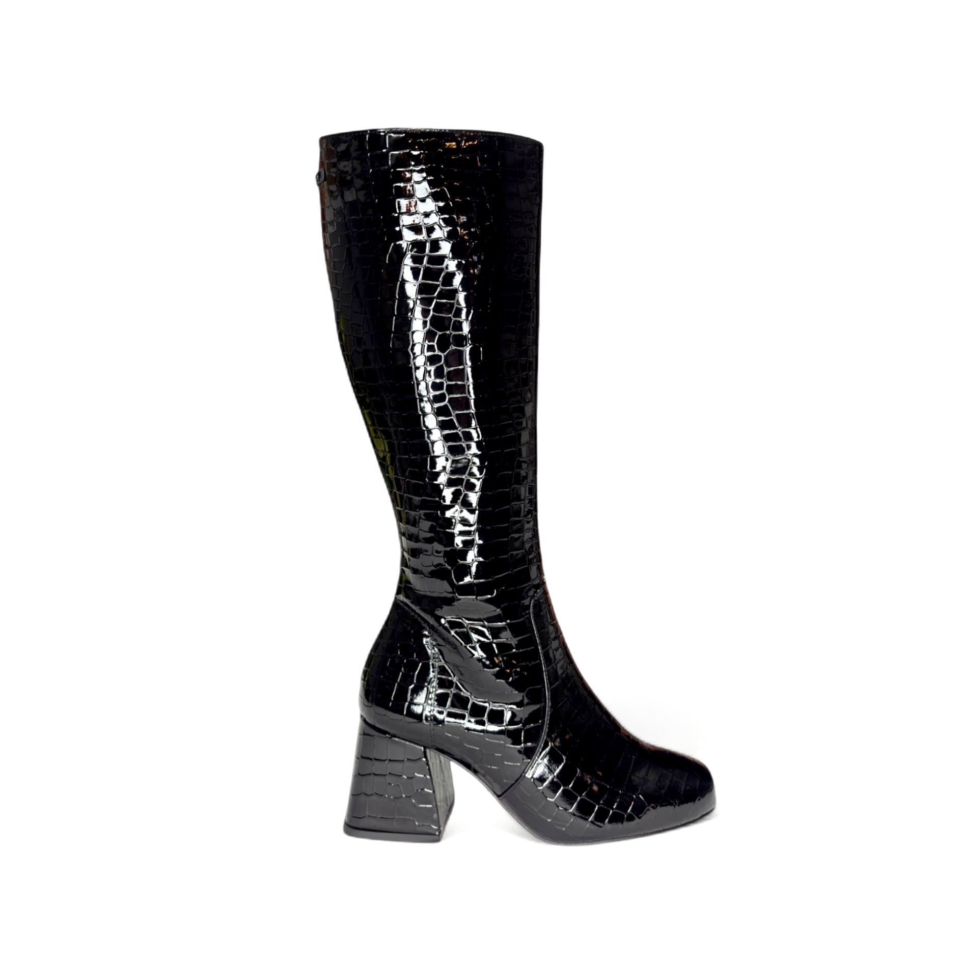 Bota alta negra con acabado efecto cocodrilo y tacón cuadrado, un diseño sofisticado y moderno que aporta estilo y elegancia a cualquier look.