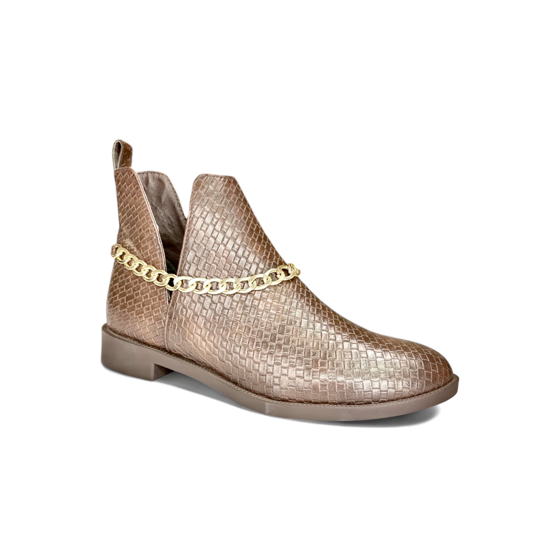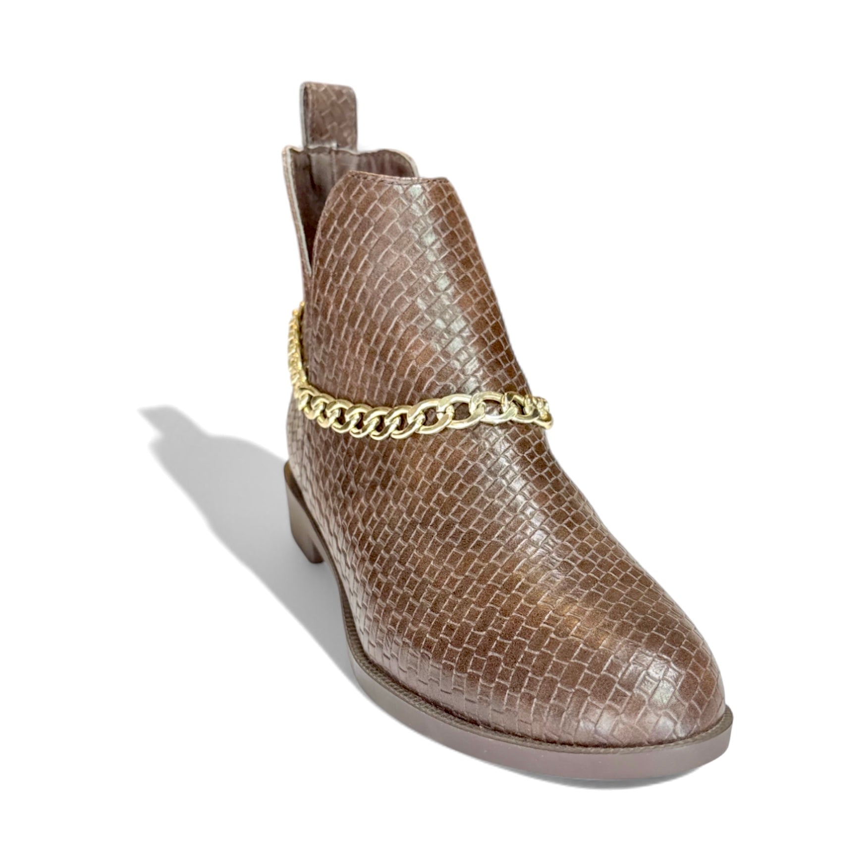 Estilo moderno y chic en este botín café con textura reptil y cadena dorada al frente. Un diseño llamativo y cómodo para realzar cualquier outfit urbano.