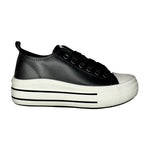 Dale un giro moderno a tu look con estos tenis tipo plataforma en color negro. Están elaborados en piel sintética de alta calidad, con diseño minimalista y suela blanca de doble altura con líneas decorativas que aportan estilo y confort. Su punta redonda blanca añade un toque urbano, mientras que su interior acolchado garantiza comodidad todo el día. Fáciles de combinar y perfectos para elevar cualquier outfit casual.
