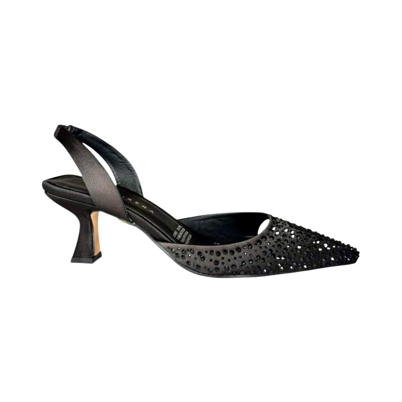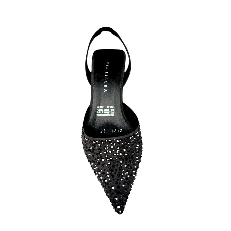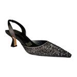 Eleva tu estilo con este sofisticado tacón slingback en color negro. Su diseño en punta fina está completamente decorado con pedrería del mismo tono, aportando un brillo sutil y elegante en cada paso. El tacón bajo y cómodo lo hace ideal para eventos especiales donde quieras lucir arreglada sin sacrificar confort. ¡Un clásico moderno que no puede faltar en tu clóset!