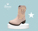 Deja que tu pequeña brille con estilo con esta encantadora botita en tono rosa pastel. Diseñada con un panel lateral cubierto de glitter multicolor y una hermosa corona con corazón, esta bota es el sueño de toda niña. Su tacón bajito y cómodo la hace ideal para jugar, salir o asistir a eventos especiales. ¡Perfecta para reinas modernas!